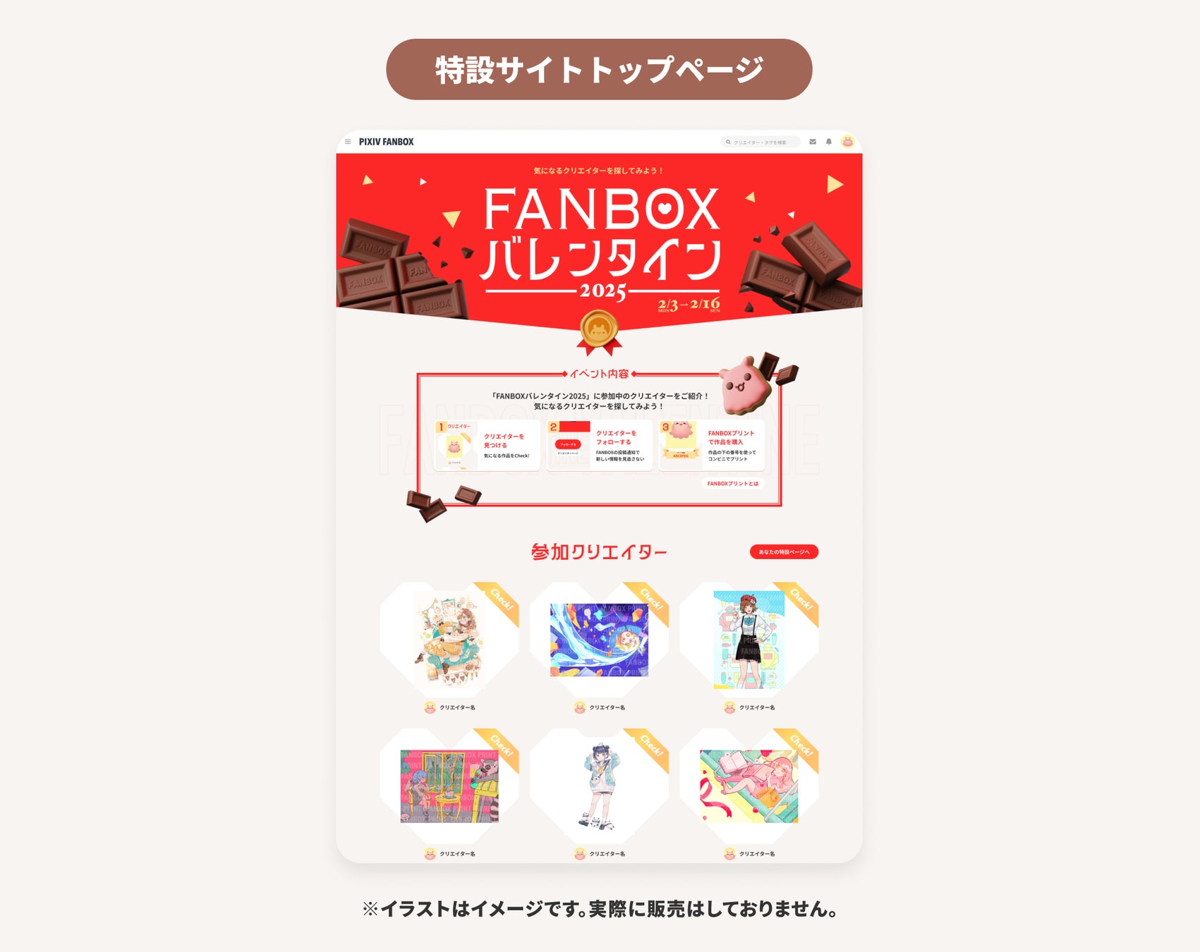 本企画では、創作活動の盛り上がりを届け、たくさんの新たなファンにクリエイターの皆さまを知っていただけるよう、クリエイターのプリント商品をバレンタインに合わせた特別な装いで掲載できる「FANBOXバレンタイン2025」特設サイトを2025年2月3日(月)から公開します。