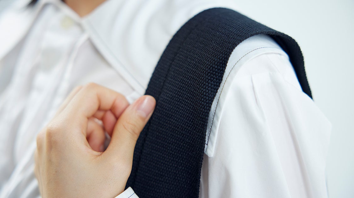 A3サイズも収納可能なバッグ本体には、少し厚手のコットンツイル素材を使用。カラーは、DEAN & DELUCAのシグネチャーカラーであるブラックに、デザインがより引き立つホワイトを合わせました。20周年のタグをあしらった内ポケット付き。さらに、肩がけしても負担になりにくいよう、持ち手は太めになっています。