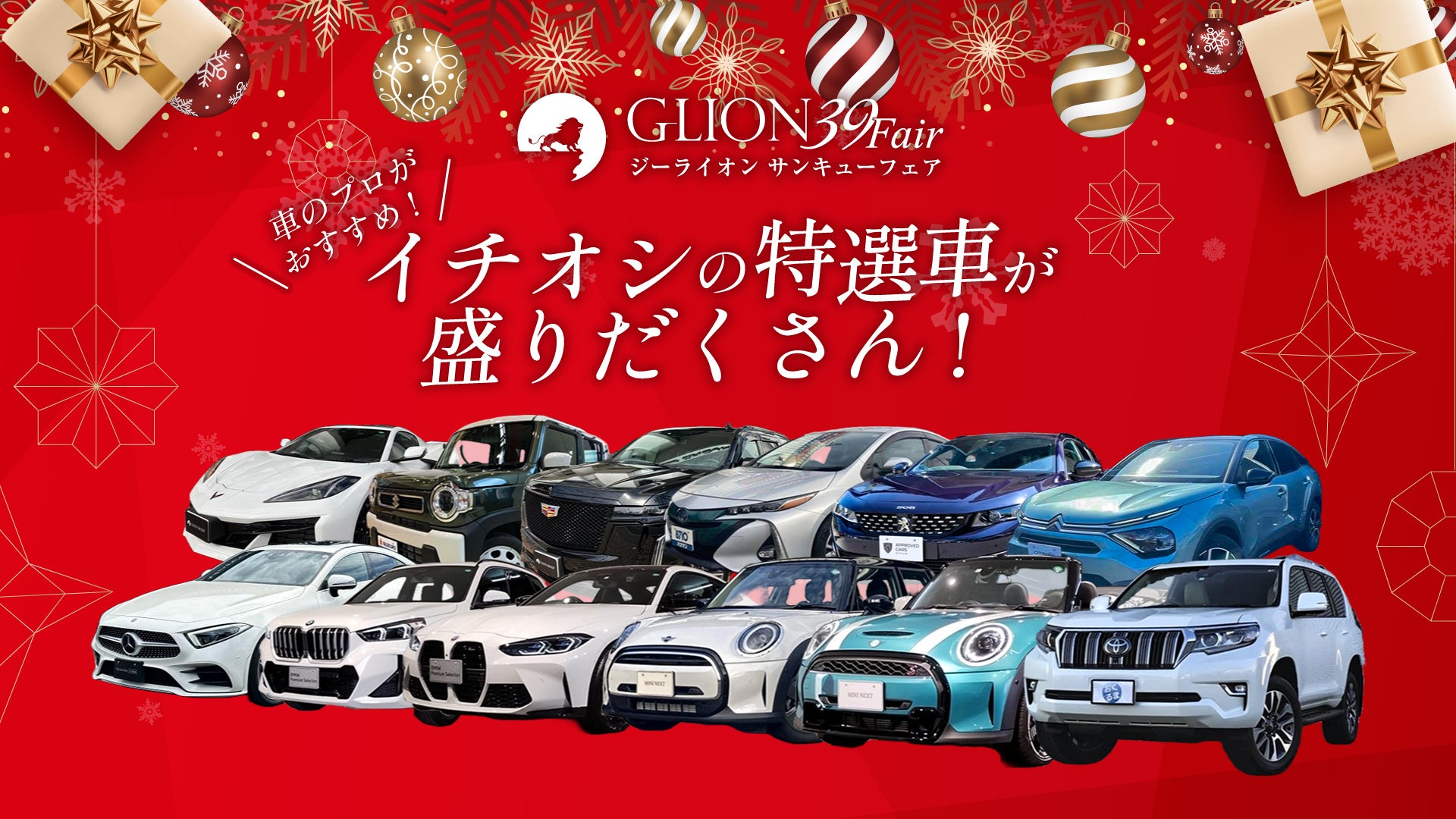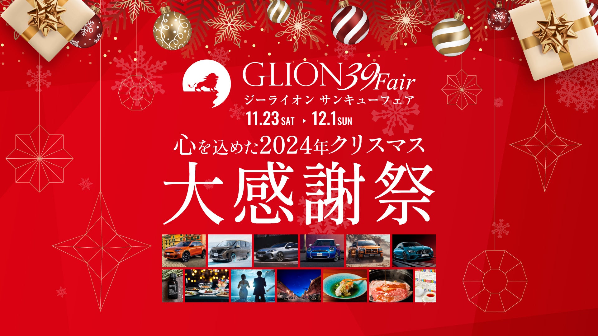 GLIONグループ(ジーライオングループ 所在地:兵庫県神戸市)は、2024年11月23日(土)から12月1日(日)までの9日間、日頃からご愛顧いただいているお客様に感謝の気持ちを込めた2024年クリスマス大感謝祭「GLION 39 Fair」を開催いたします。車のプロがオススメする人気のイチオシ車両や期間中にご成約いただいた方限定のダブルチャンス企画を実施。ぜひこの機会にGLIONグループ各店舗へお越しください。