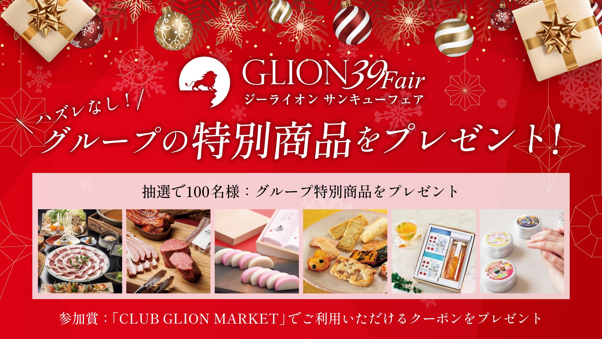 期間中にGLIONグループが運営する「CLUB GLION」にご入会いただきました方に豪華特典をプレゼントいたします。今回はハズレなしとなっており抽選で100名様には商品プレゼント、参加賞としてCLUB GLION会員様限定のECサイト「CLUB GLION MARKET」でご利用いただけるクーポンをプレゼントいたします!