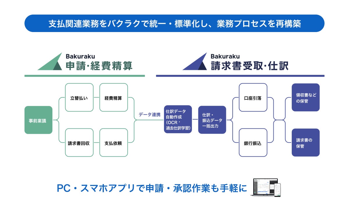 バクラクは、稟議、経費精算、法人カード、請求書受取、請求書発行、勤怠管理などの業務を効率化するクラウドサービスです。最先端のAIを組み込むことで、手入力や紙の管理などの業務から解放し、従業員一人ひとりがコア業務に集中できる新しい働き方を創造します。中小企業から大企業まで、10,000社を超えるお客様の働きやすい環境づくりと事業成長を支援しています。