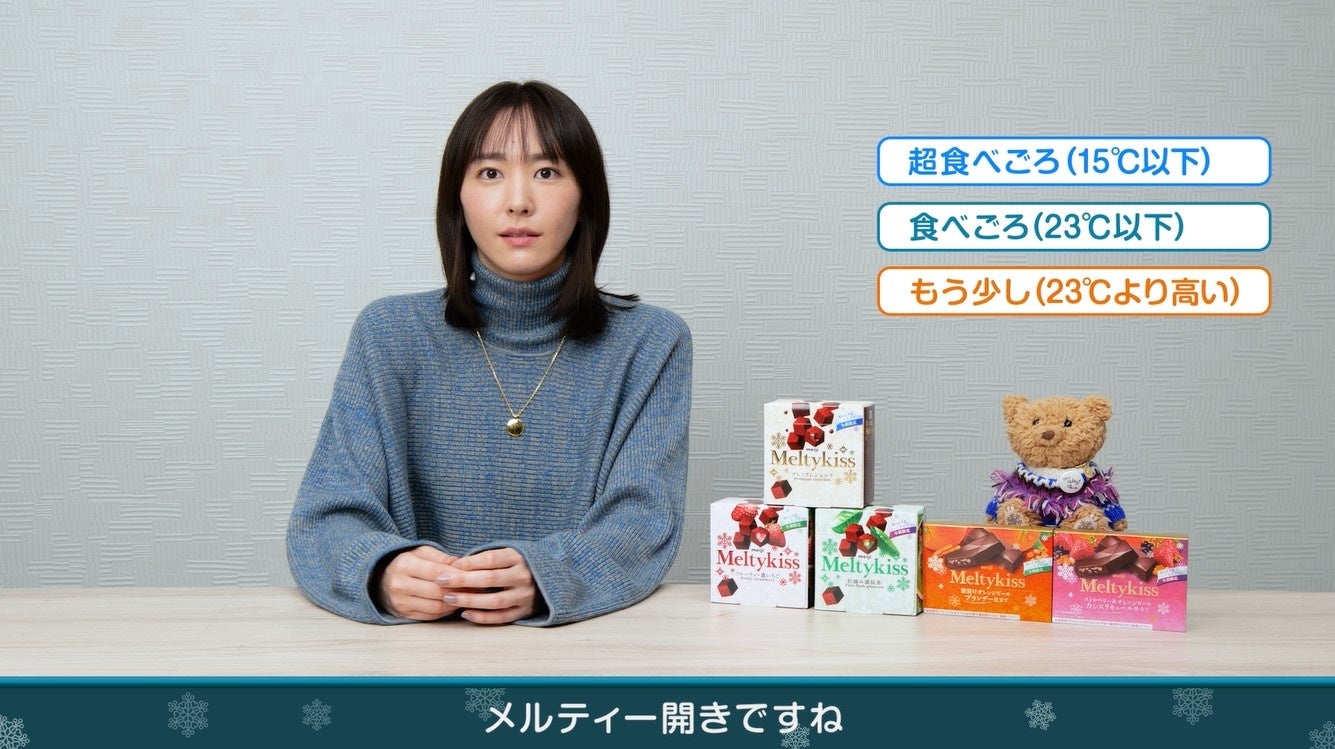 女優・新垣結衣(あらがき・ゆい)が広告キャラクターを務める冬期限定チョコレート「メルティーキッス」より、「メルティーキッスプレミアムショコラ/フルーティー濃いちご/初摘み濃抹茶」の3品が10月25日より全国にて販売開始します。そしてこの度、「メルティーキッス」新音声CMが初解禁となります。新垣が「メルティーキッス」の広告に出演して12 年目となります。