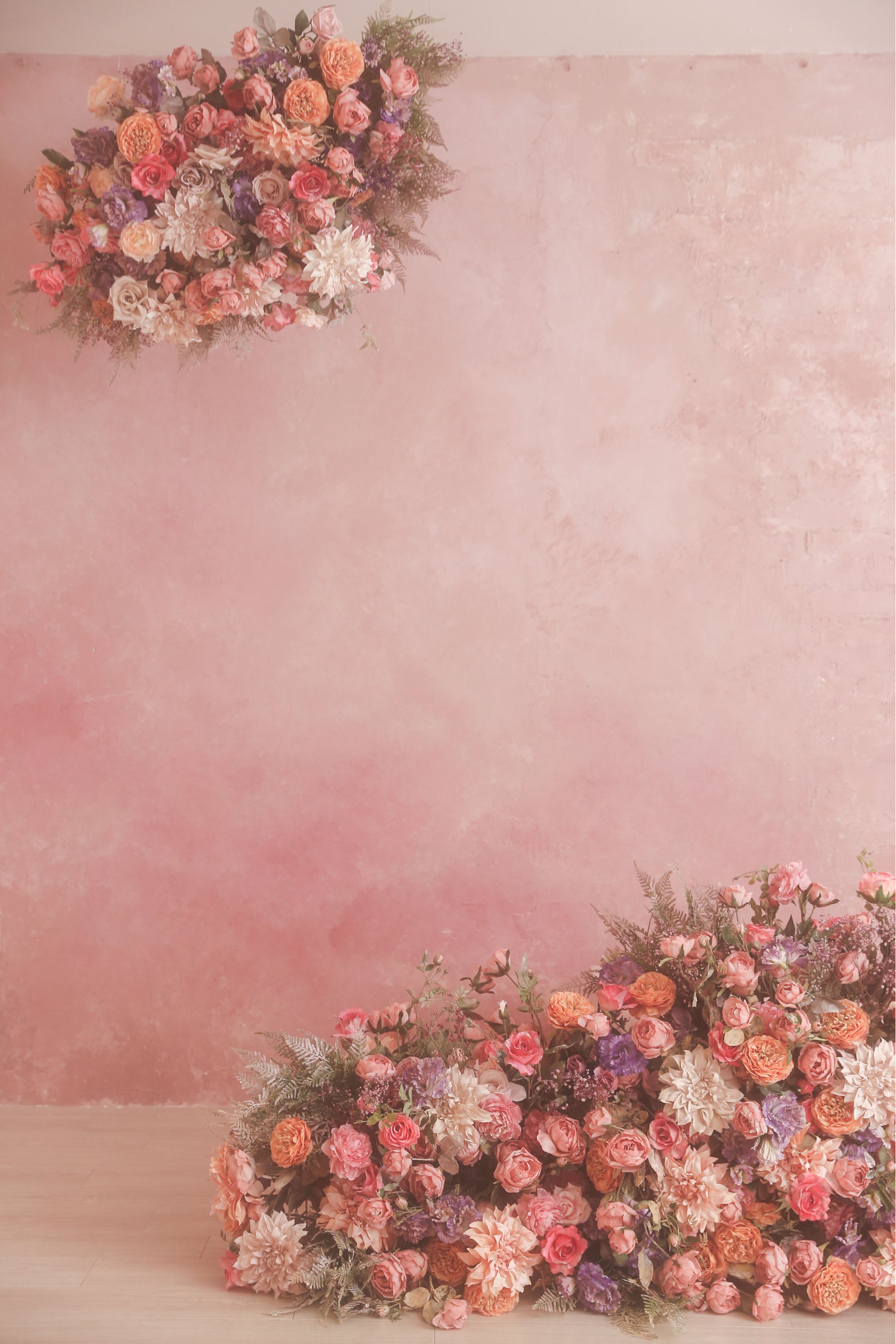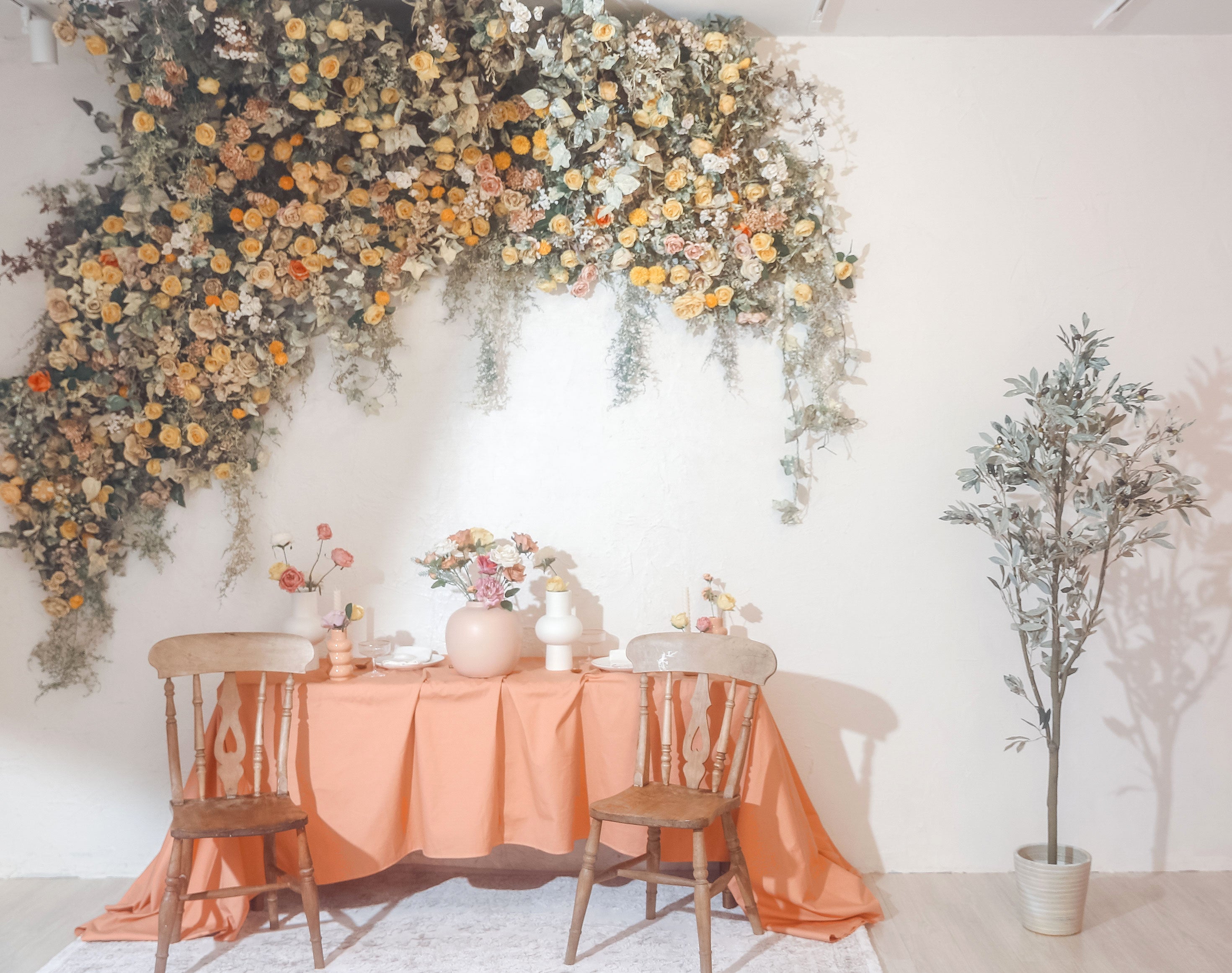 ピンクの壁とピンクベースの花々が可愛らしい空間です。