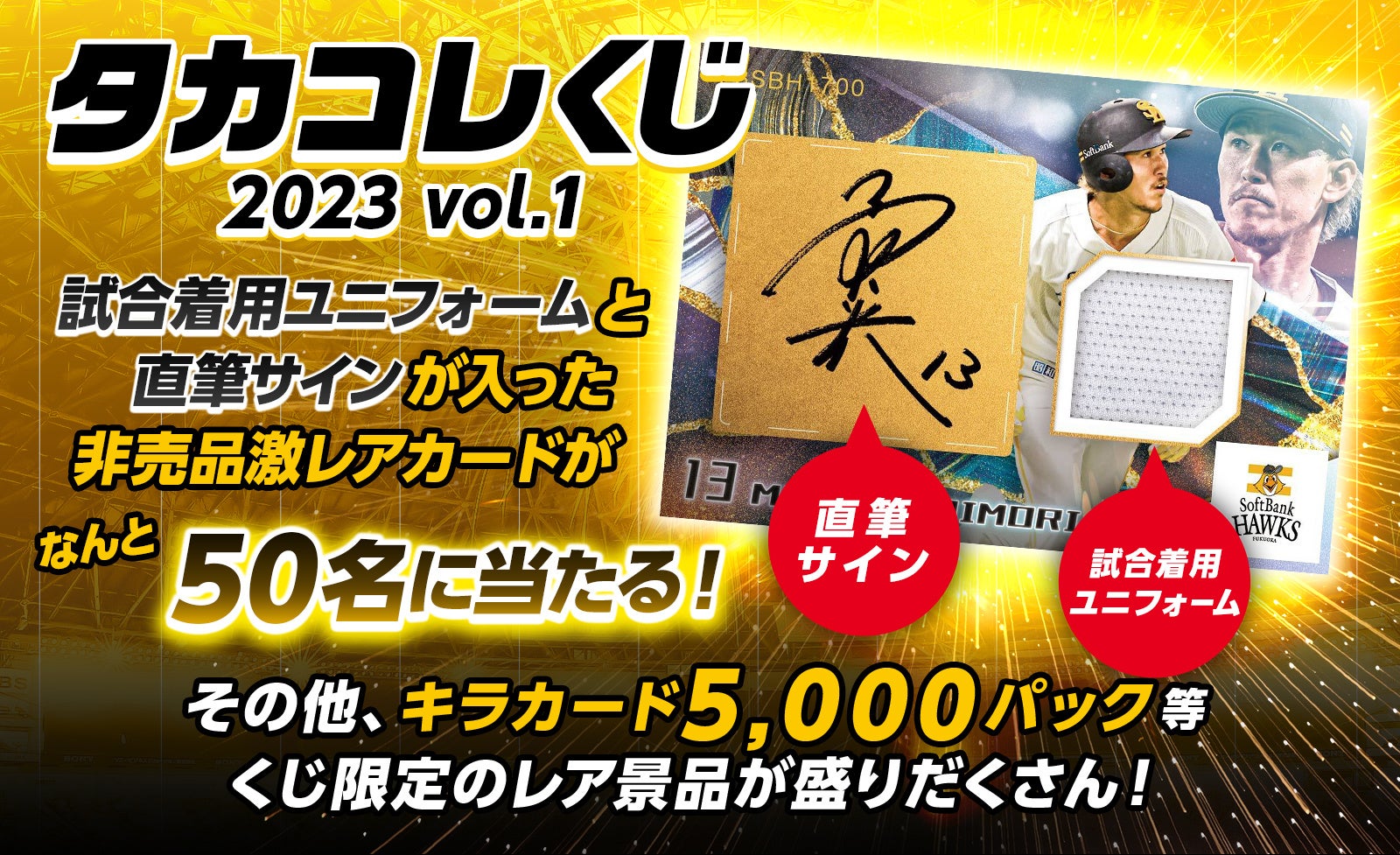 また、タカコレカード販売を記念して、スマホ・PCから簡単に購入できるオンラインくじ「タカコレくじ」も同時スタート。「タカコレくじ」はTixplusのオンラインくじプラットフォーム「くじプラ」にて販売いたします。選手が試合で着用したユニフォームと直筆サインが入った、証明書付きの激レア非売品カードを50名様に、さらに、貴重なホログラムカードのみが入ったくじ限定パックも5,000パックご用意いたしました。