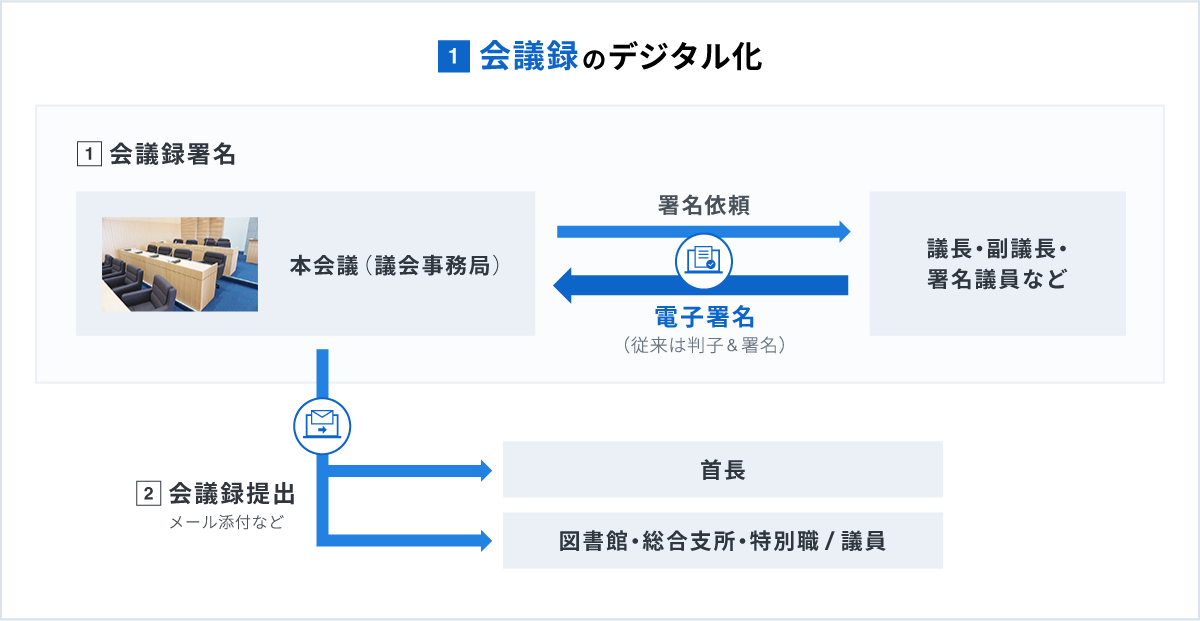通常、会議録の公開は、会議録制作会社への納品から、議長・副議長・署名議員からの押印、その後に首長や議員、図書館等へ郵送され公開がなされるフローとなっています。現状そのフローの大部分が紙や判子を活用した決裁となっており、本サービスを活用することにより、会議録の公開までのフローのデジタル化が可能になります。これにより、決裁手続きや会議録の共有を簡略化し、より会議録の公開までのタイムロス削減を担うことが可能になります。