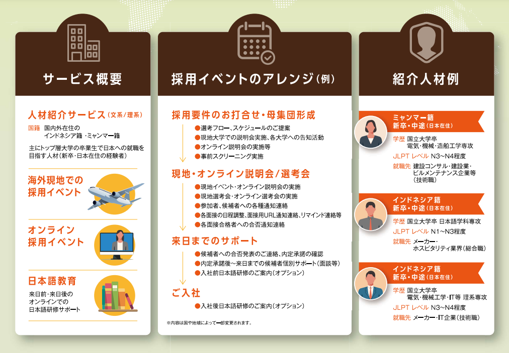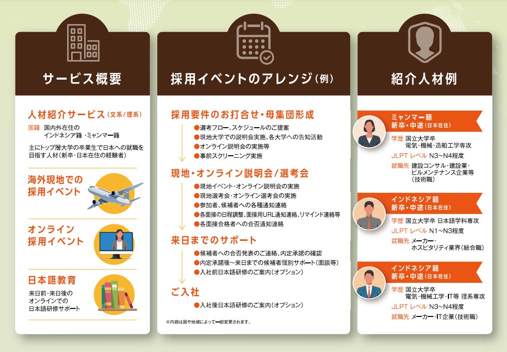 採用戦略のご提案から母集団形成、現地・オンライン説明会や選考会、内定承諾フォロー、日本語教育まで、採用にかかるフローを一貫して承ります。