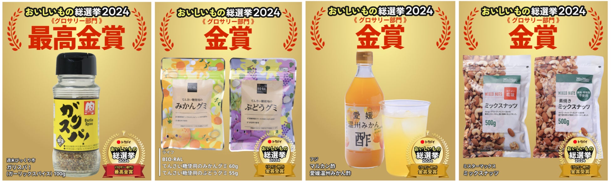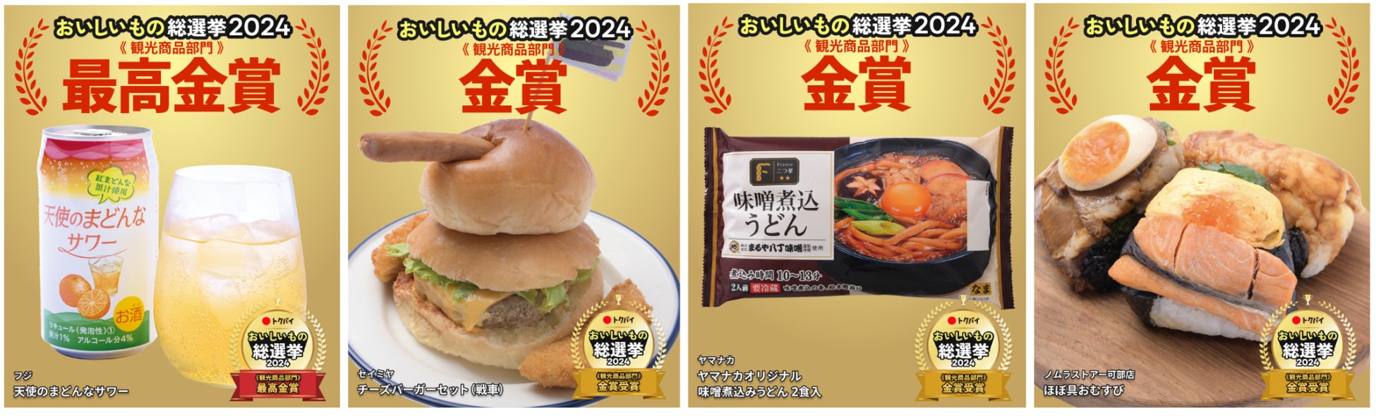 2024年7月1日(月)〜22日(月)の期間に行なった一般生活者からの投票※の結果、5部門の最高金賞には、【デリカ部門 】週末びっくり市の「やりすぎサンド」、【スイーツ部門 】エコス、TAIRAYAの「関口シェフのクッキーシュー」、【グロサリー部門 】週末びっくり市の「ガリスパ!」、【 生鮮・日配部門 】バローの「まぐろ握り鮨(ネギトロ入)」、【観光商品部門 】フジの「天使のまどんなサワー」が選ばれました。