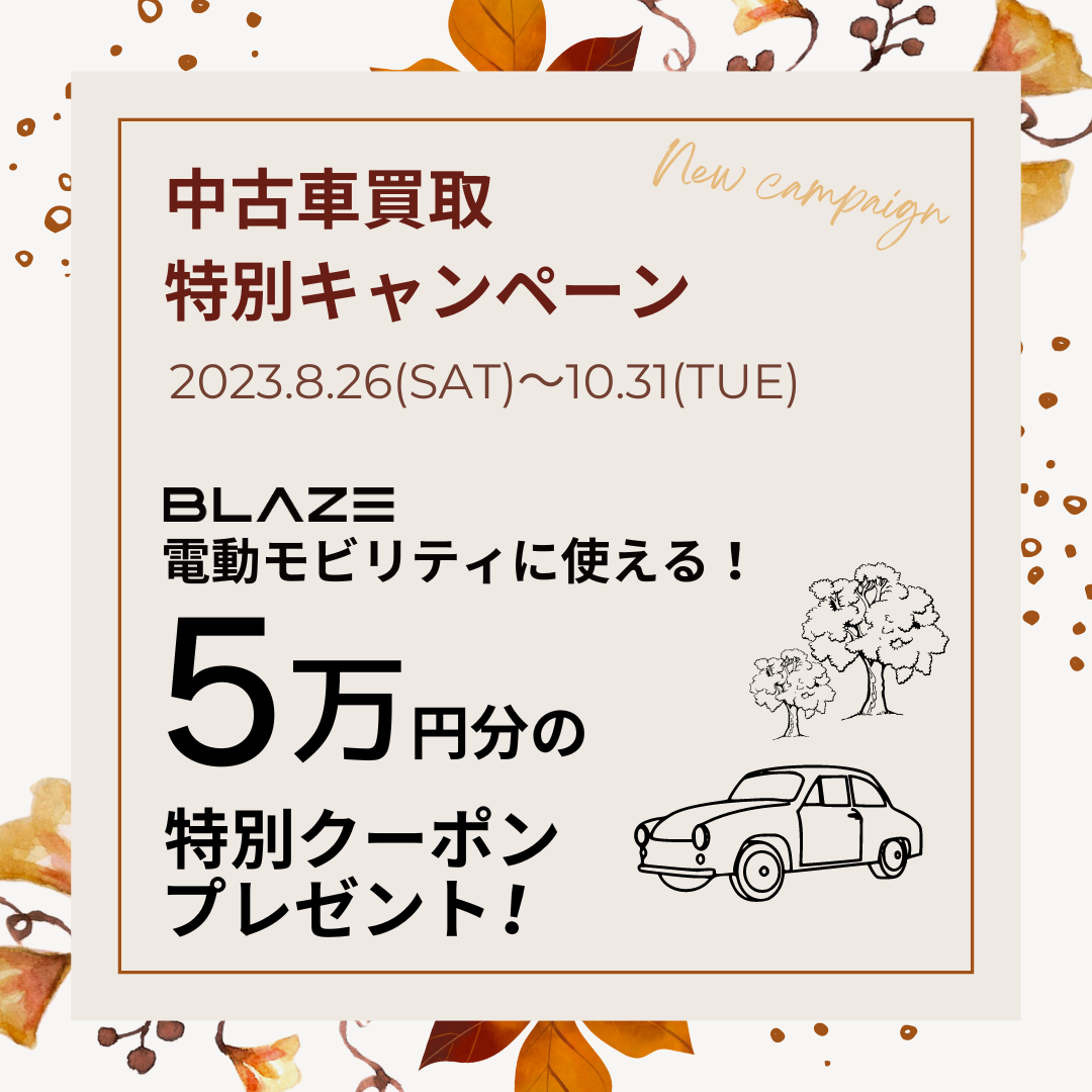 この度の「中古車買取特別キャンペーン」では下記の通り、キャンペーン期間中にご所有されているお車の買取ご成約のお客様に、話題の「特定小型原動機自転車」区分対応の新モデル「キックボードEV」や、スタイリッシュ&コンパクトデザインで人気の「ブレイズ スマートEV」などのブレイズ電動二輪シリーズ商品他、豊富な電動モビリティ・ラインアップ商品すべてにご利用いただける「ブレイズUcar買取支援クーポン:5万円分」をプレゼント!ぜひこの機会を逃さず、ご活用ください。