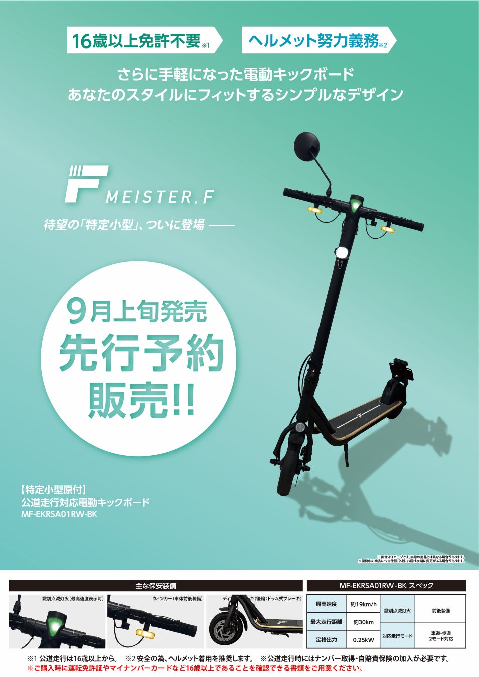 「一般原動機付自転車」区分にあたるMF-EKRA01S-BKの販売と、「特定小型原動機付自転車」区分のMF-EKRSA01RW-BK(9月上旬発売予定)の予約受付を8月から随時各店にて開始いたします。