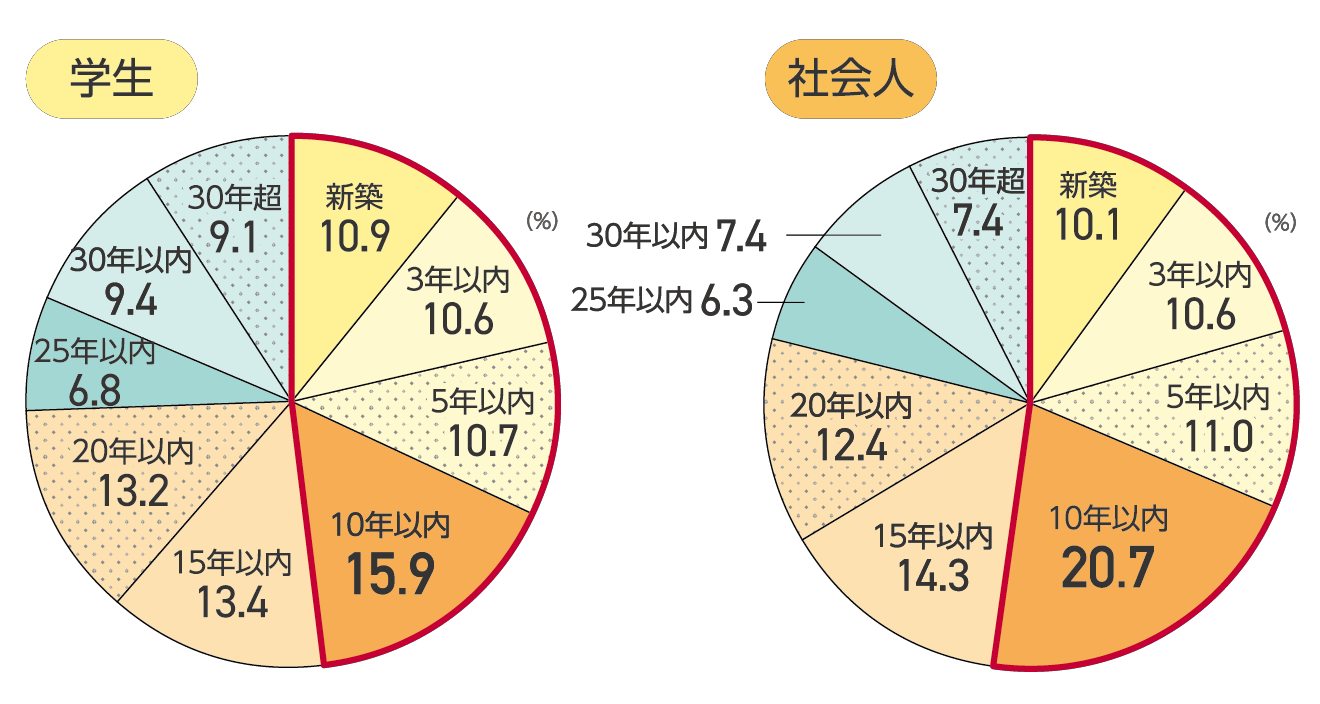 築年数は学生・社会人ともに約半数が「10年以内」