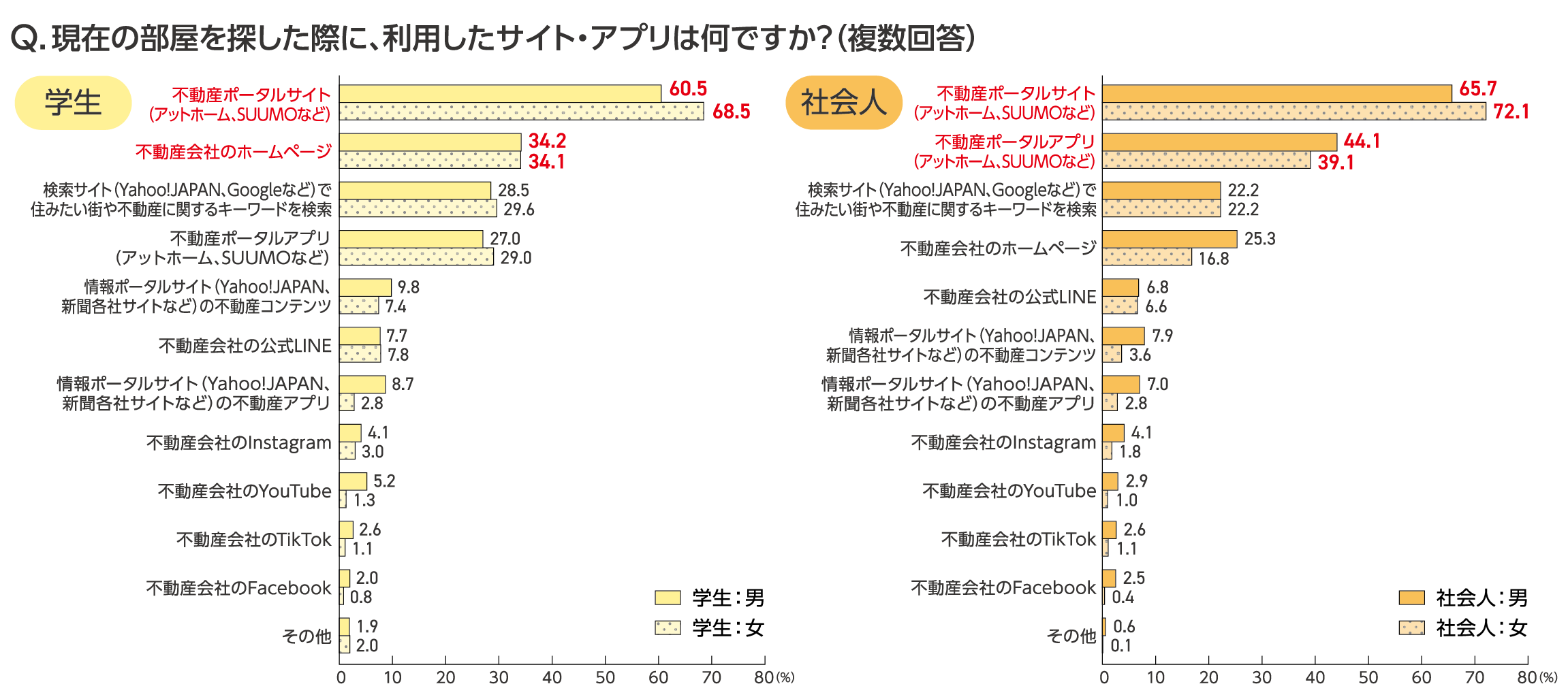 現在の部屋を探した際に、利用したサイト・アプリについて学生・社会人ともに「不動産ポータルサイト(アットホーム、SUUMOなど)」がトップでした。次いで、学生は「不動産会社のホームページ」、社会人は「不動産ポータルアプリ(アットホーム、SUUMOなど)」という結果になりました。
