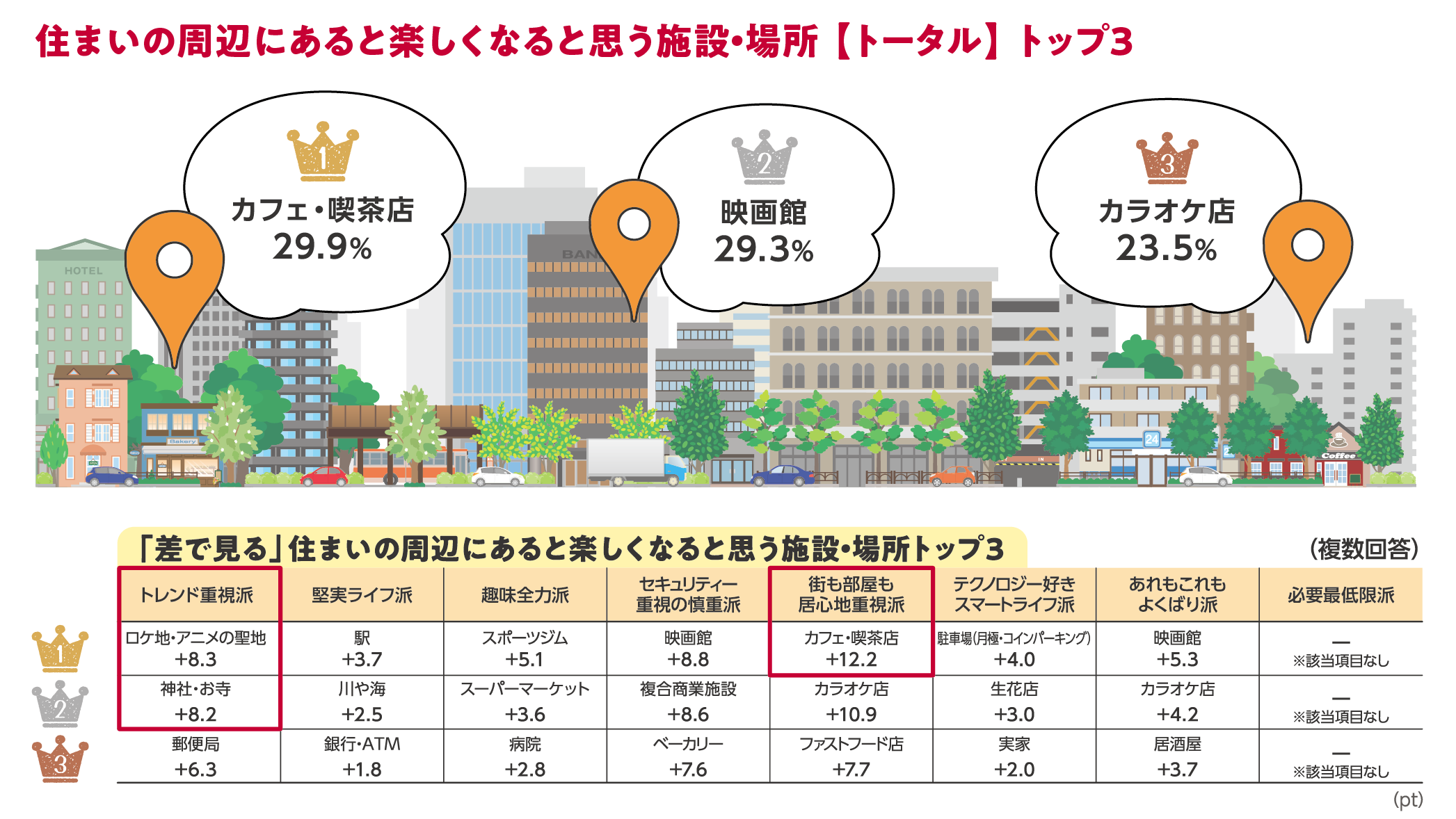 住まいの周辺にあると楽しくなると思う施設・場所については、「カフェ・喫茶店」「映画館」「カラオケ店」がトップ3となりました。