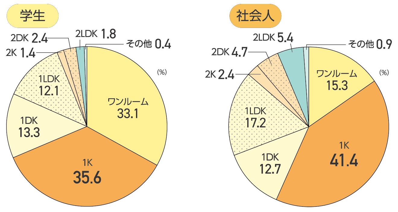 現在の部屋の間取りは、学生・社会人ともに「1K」がトップ