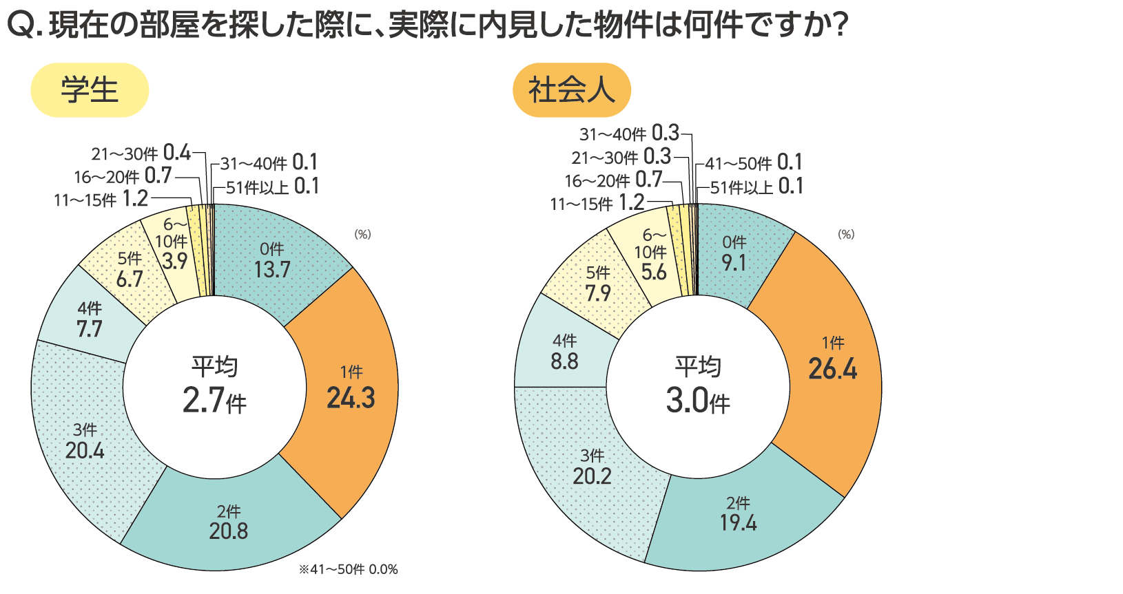 内見した平均物件数、学生は2.7件、社会人は3.0件