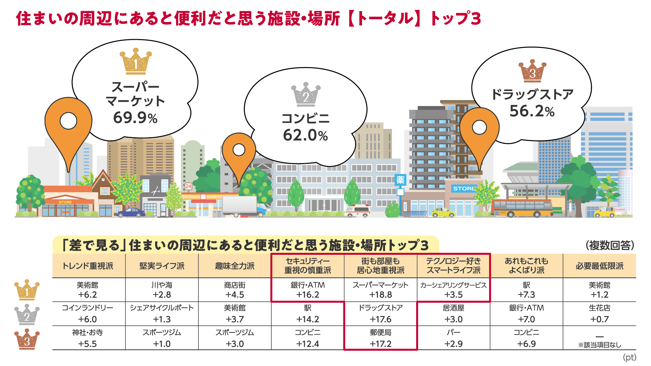 タイプ別に全体平均との差が大きいものを見ると、『街も部屋も居心地重視派』はトップ3が+17ポイント以上でそれぞれの施設・場所を特に重視しているようです。また、『セキュリティー重視の慎重派』は「銀行・ATM」を重視、『テクノロジー好きスマートライフ派』は「カーシェアリングサービス」を重視とそれぞれの特徴が見られました。