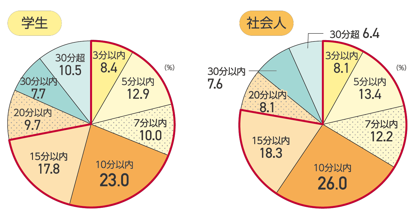 最寄り駅までの徒歩分数は、学生・社会人ともに半数以上が「10分以内」