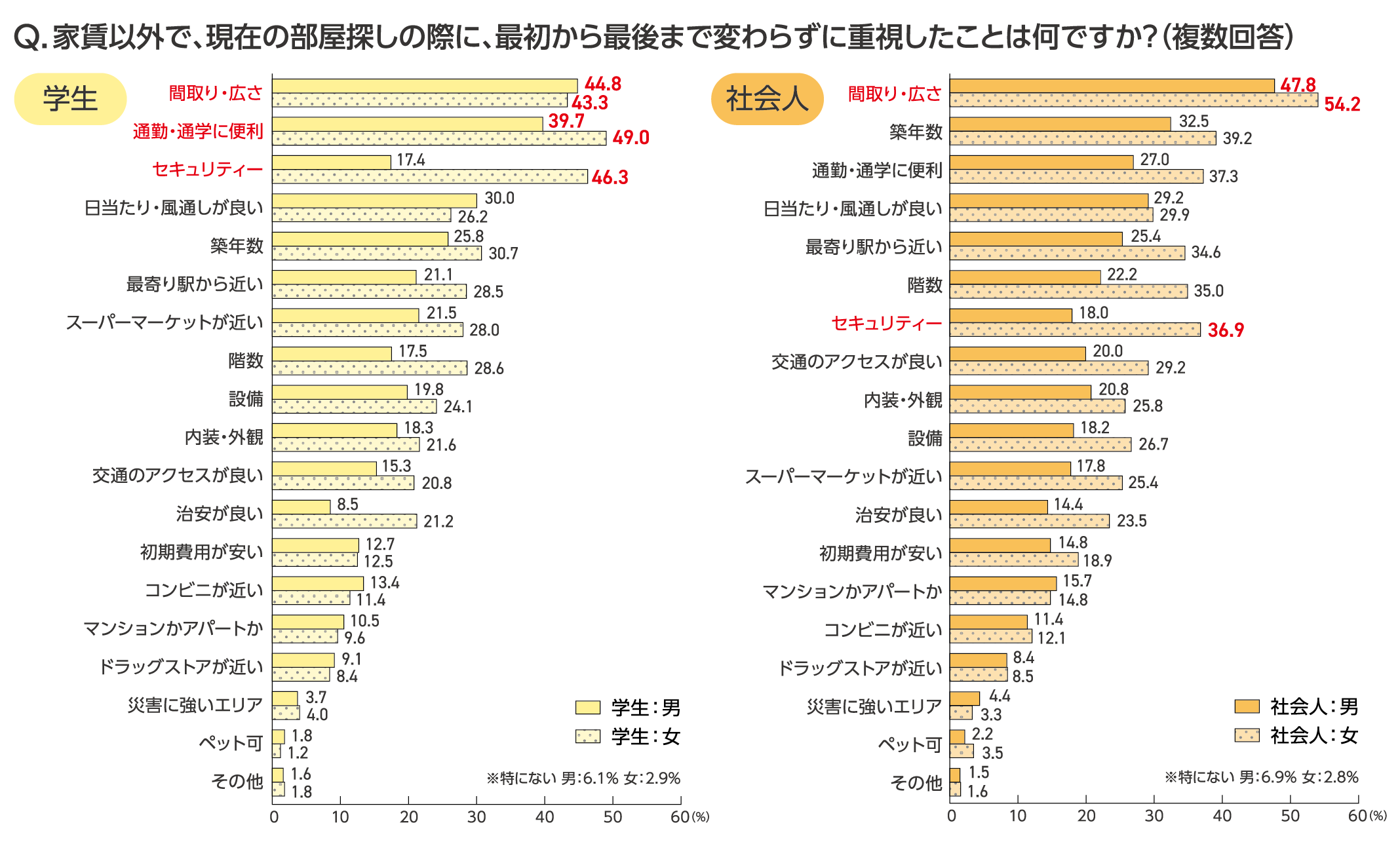 学生・社会人ともに「間取り・広さ」が最後まで重視したことのトップとなりました。学生は「通勤・通学に便利」へのこだわりも強いようです。学生女性・社会人女性は約40%が「セキュリティー」を重視している一方、学生男性・社会人男性は約20%と2倍以上の差が見られました。