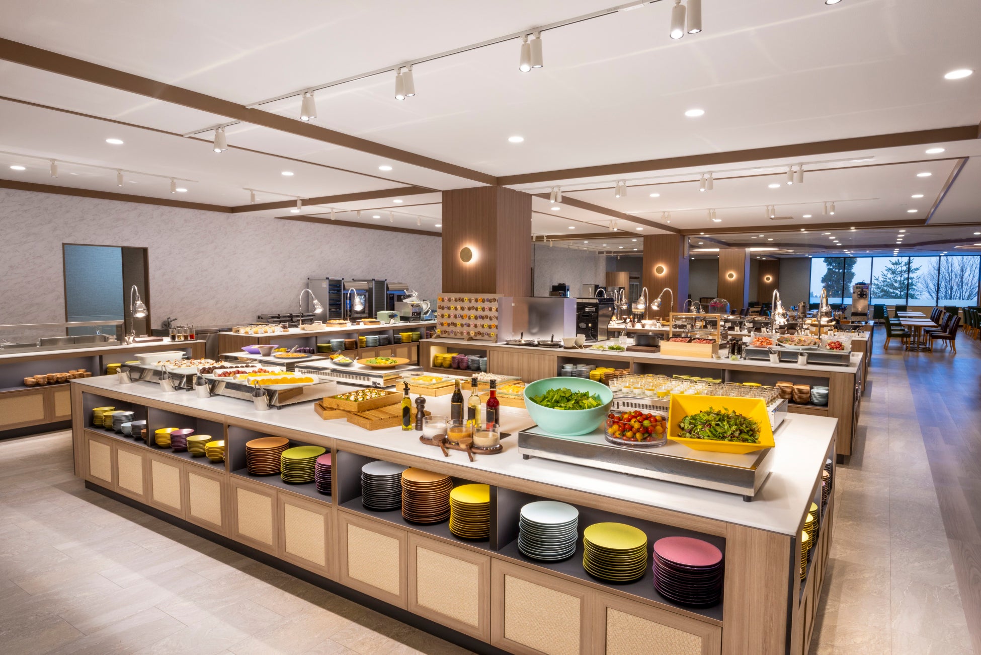 メルキュール富山砺波リゾート&スパでは、夕朝食をビュッフェで提供しています。オールインクルーシブの料金内で味わうことができる通常メニューでも「白えびのかき揚げ」や「紅ズワイ蟹汁」「富山おでん」など、郷土色豊かなローカルフードが味わえます。