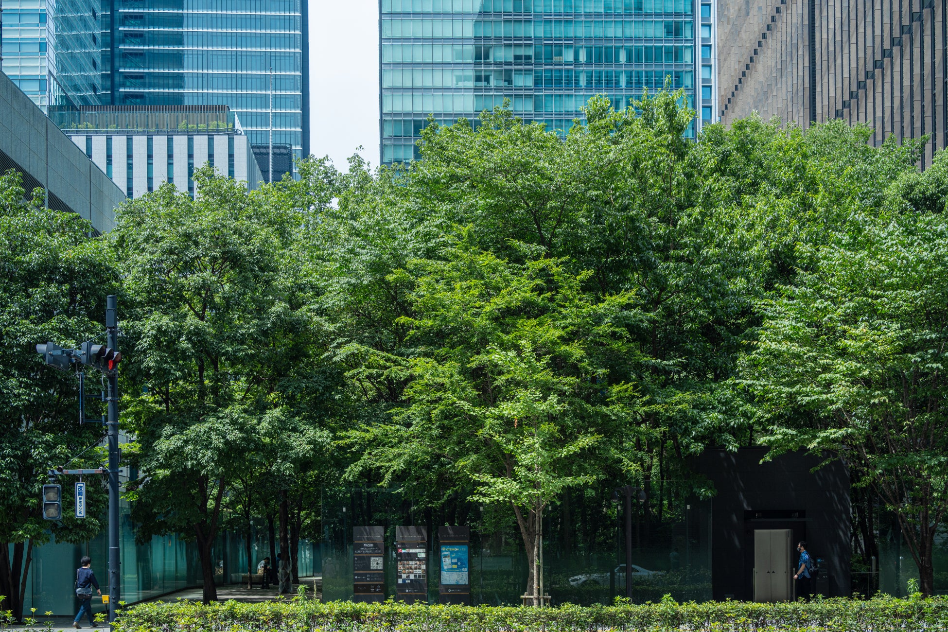 千葉県君津市内の山林で約3年間をかけて実際に木々や草花を育成する「プレフォレスト」という手法を採用し、建物の竣工にあわせて土壌や植物を移植。竣工以来、自然の森に近い形での管理を継続しており、皇居外苑など周辺の緑地も含めたエリア一帯での生態系ネットワーク形成に寄与。