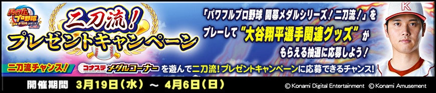 株式会社コナミアミューズメントは、アミューズメント施設向けメダルゲーム『パワフルプロ野球 開幕メダルシリーズ! 二刀流!』と、PCやスマートフォンでアーケードゲームが楽しめる『コナステ メダルコーナー』にて、KONAMI野球ゲームアンバサダーの大谷翔平選手の関連グッズなどが当たる「二刀流!プレゼントキャンペーン」が開催していることをお知らせします。