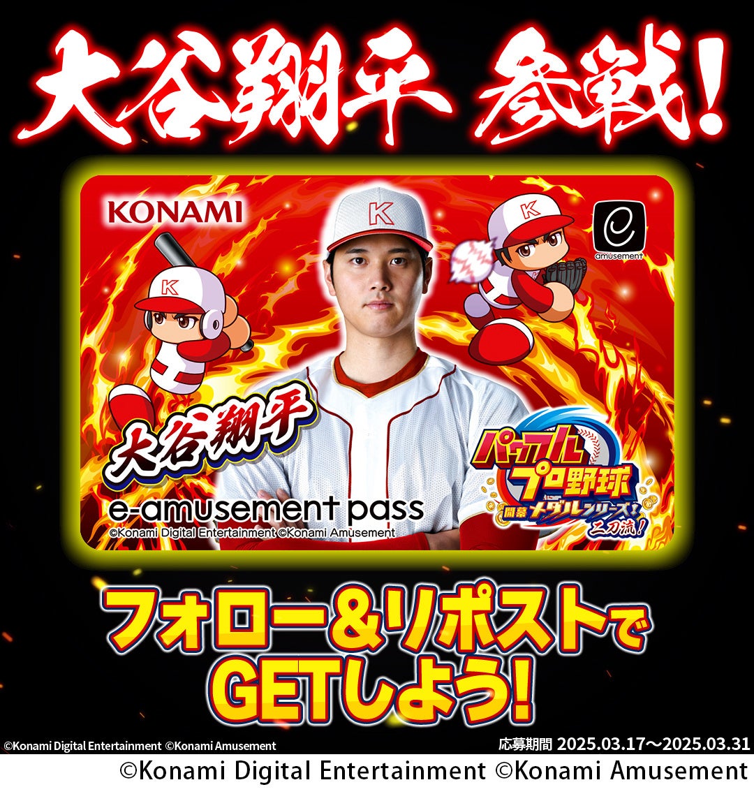 『KONAMIメダルゲーム通信』公式Xにて、大谷翔平選手デザインの「オリジナルe-amusement passカード」などが当たる「大谷選手来日!『パワフルプロ野球 開幕メダルシリーズ! 二刀流!』フォロー&リポストキャンペーン」を開催します。