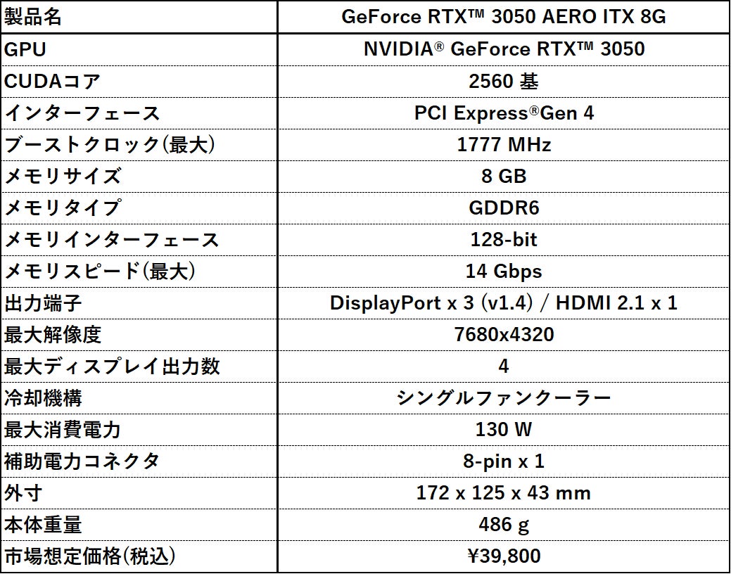 【GeForce RTX™ 3050 AERO ITX 8G】