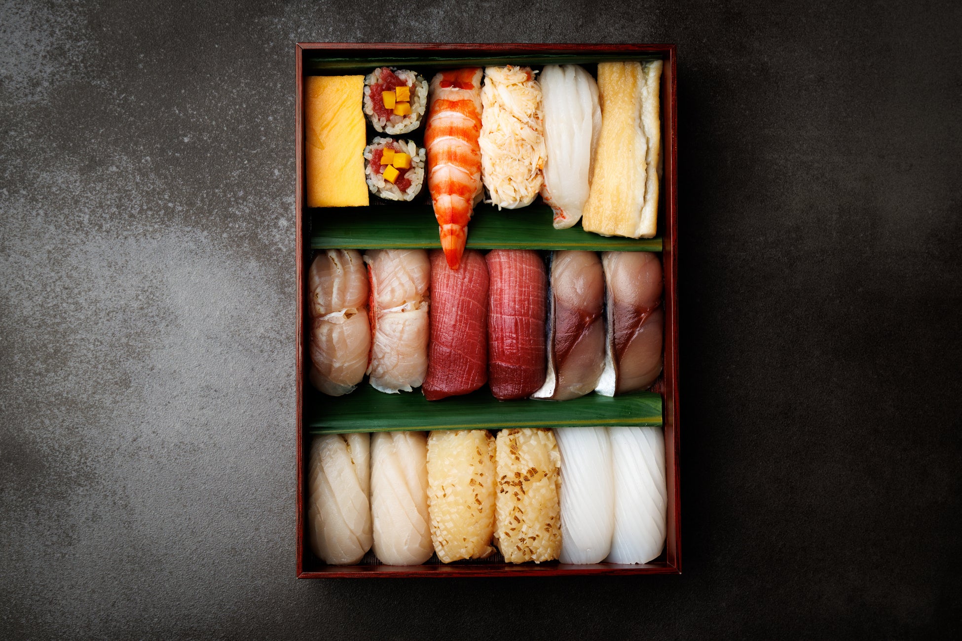 握りと同じ鮨ネタを贅沢に盛り込んだ、華やかな一折。