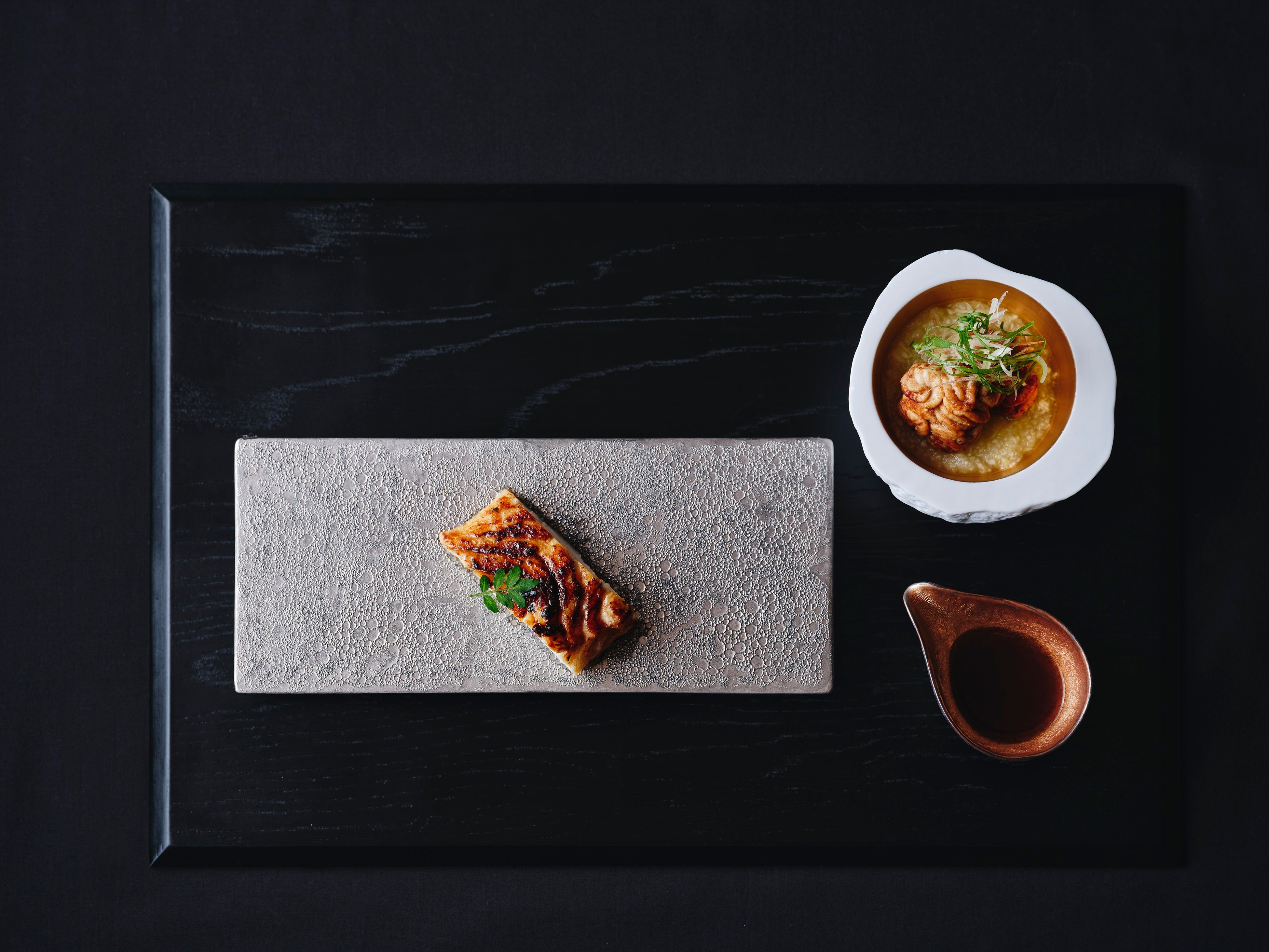 旬の寒鱈を、味噌とヘーゼルナッツをまとわせふっくらと仕上げた一品。濃厚な白子のムニエルは、出汁を加えた 聖護院かぶのすり流しとともにお召し上がりください。