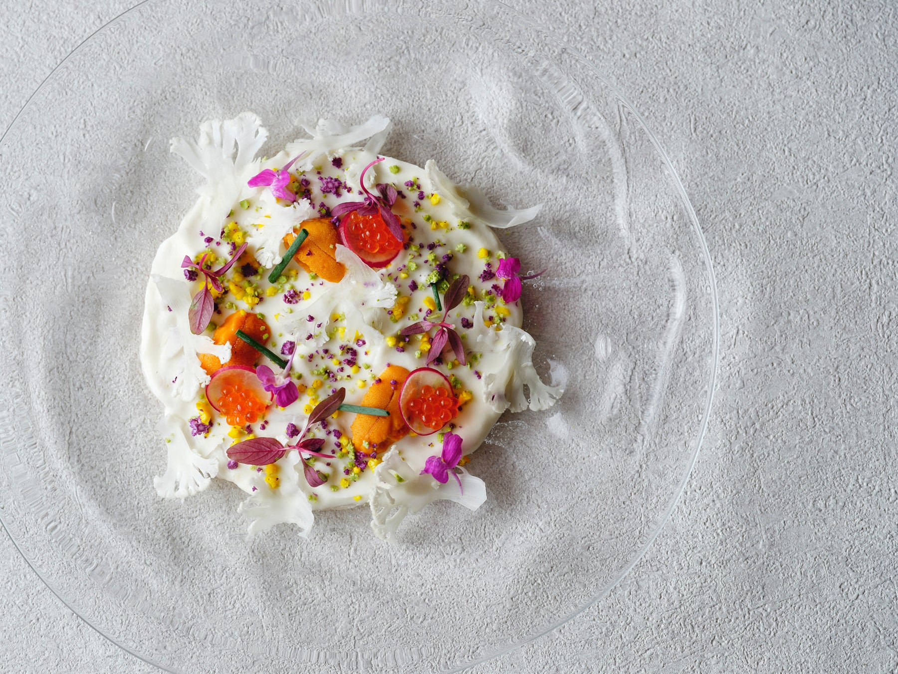 甘みのある帆立貝にカリフラワーのソースをあわせ、冬景色をイメージした前菜。雲丹やイクラで飾り付けた華やかな一皿です。