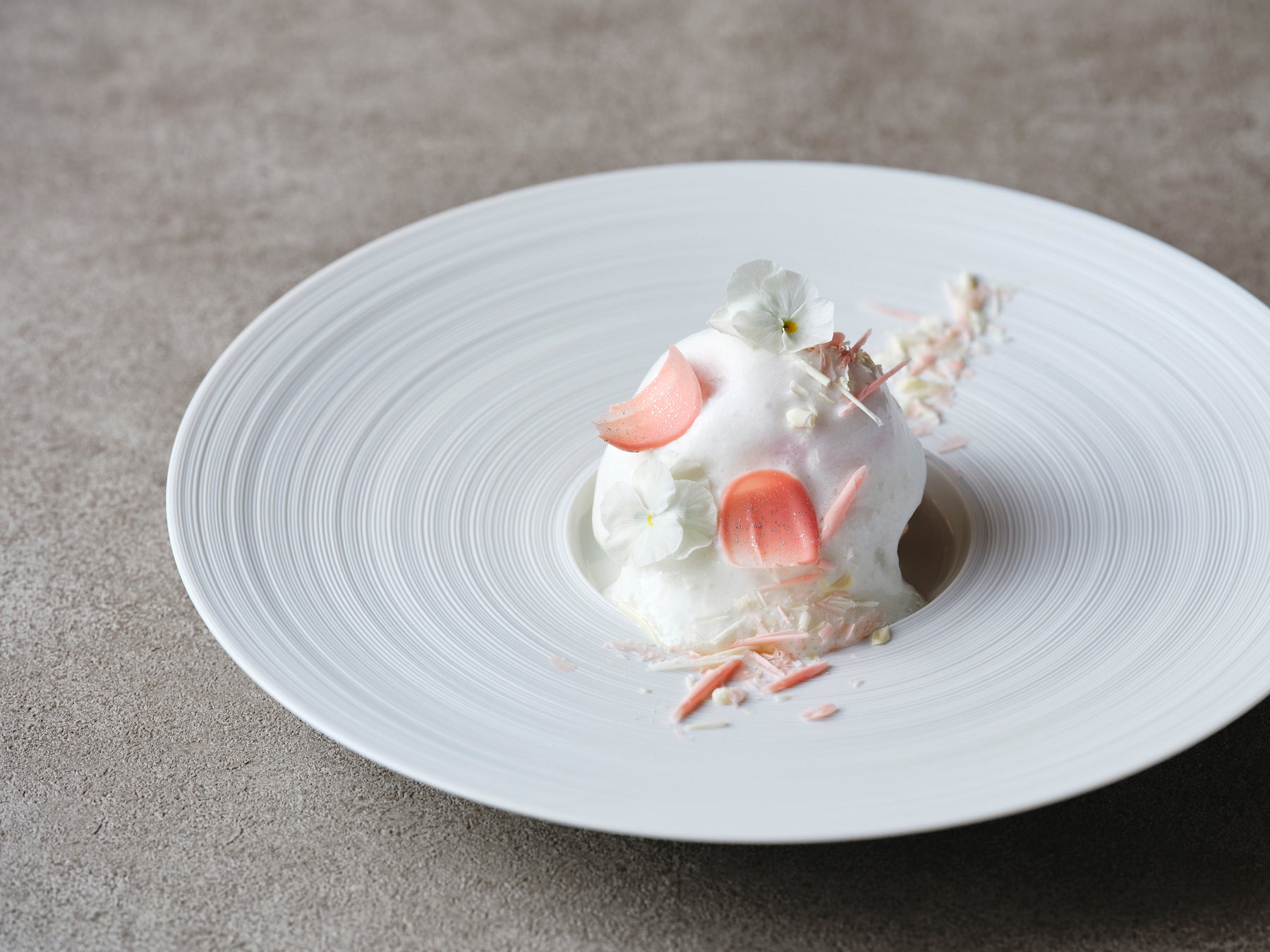 フランス産「マラデボア」苺のアイスクリ ームに、ミルクチョコレートと紅茶のクリ ームを重ね、上からカモミールとフロマー ジュブランのエスプーマをかけた冬らしい デザート。