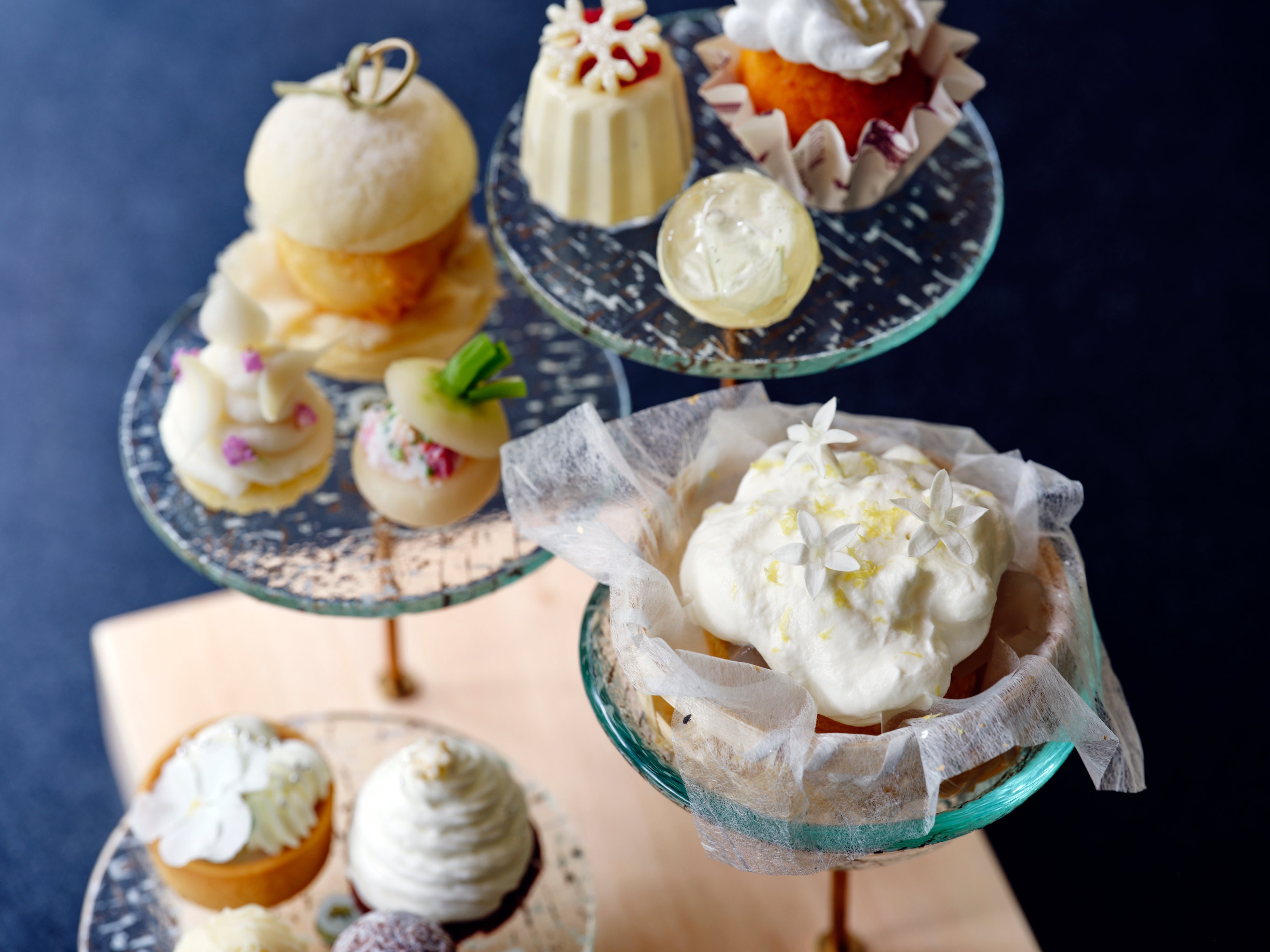 レストラン「TENJIN」では、雪化粧をした鷹峯の自然をテーマに、ホワイトを基調とした煌びやかな スイーツやセイボリーが並ぶ「アフタヌーンティー -kitayama sugi-」をご提供いたします。柚子や檸檬、金木犀の香るスイーツや、帆立貝やズワイ蟹など冬の味覚を取り入れたセイボリーなど、丁寧に仕立てられた品々が北山杉をイメージしたティースタンドを煌びやかに白く染め上げます。