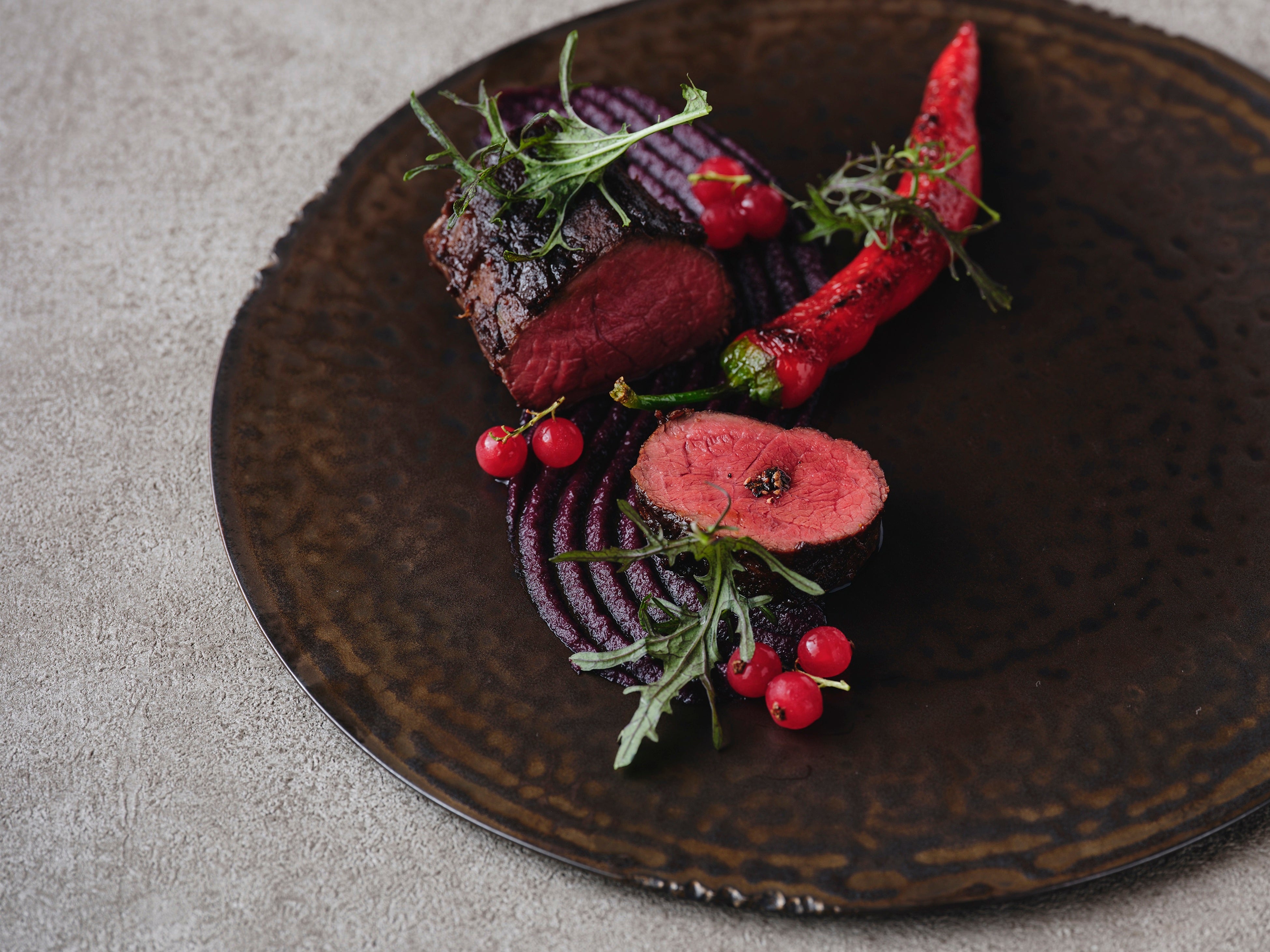味噌とヘーゼルナッツでコクをプラスした鹿肉のロースト、紫人参のピューレを添えた一品。胡椒の風味とグロゼイユの酸味が効いたグランヴヌールソースが素材の味を引き立てます。