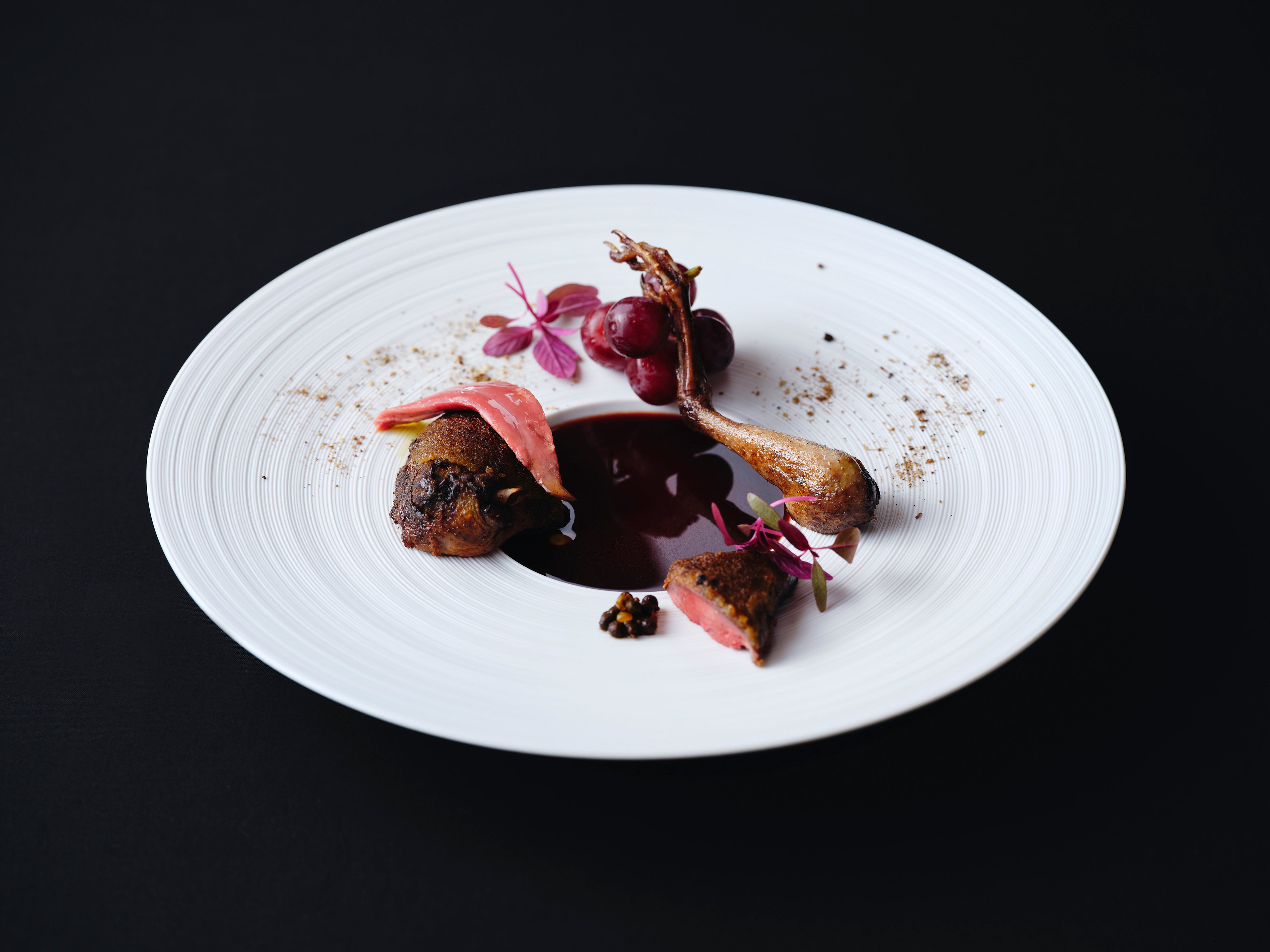 フランス産仔鳩を、ムネ肉はローストにし、モモ肉はコ ンフィに仕立てた一皿。スモークした葡萄と山椒の香る 赤ワインソースでお楽しみください。
