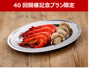 「40回開催記念プラン」をご注文のお客様に、海老(ブラックタイガー)と帆立のプレートをご用意。