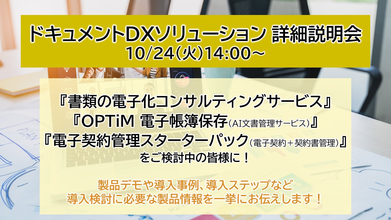 そこで本セミナーでは、『書類の電子化コンサルティングサービス』『OPTiM 電子帳簿保存』『電子契約管理スターターパック』の3つの製品・サービスについて、製品概要だけでなく、デモや導入事例、導入ステップなど、導入検討に必要な情報を、各製品約30分の講演でわかりやすく解説いたします。