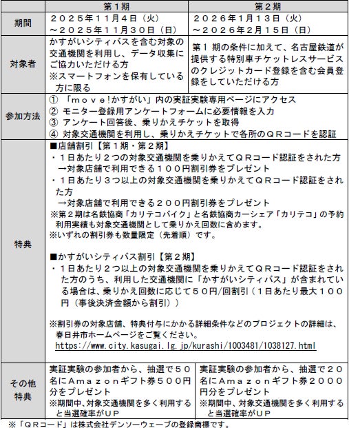 愛知県春日井市、国立大学法人東海国立大学機構 名古屋大学(以下「名古屋大学」)、一般財団法人計量計画研究所(以下「IBS」)、大日本印刷株式会社(以下「DNP」)、名古屋鉄道株式会社(以下「名鉄」)、東海旅客鉄道株式会社(以下「JR東海」)が参画する春日井市MaaS推進検討会(代表幹事:IBS)では、公共交通の利用促進を目指し、公共交通の利便性向上の検討を進めています。このたび、春日井市内の公共交通をより便利に、おトクに使っていただくための実証実験を実施しますので、お知らせします。