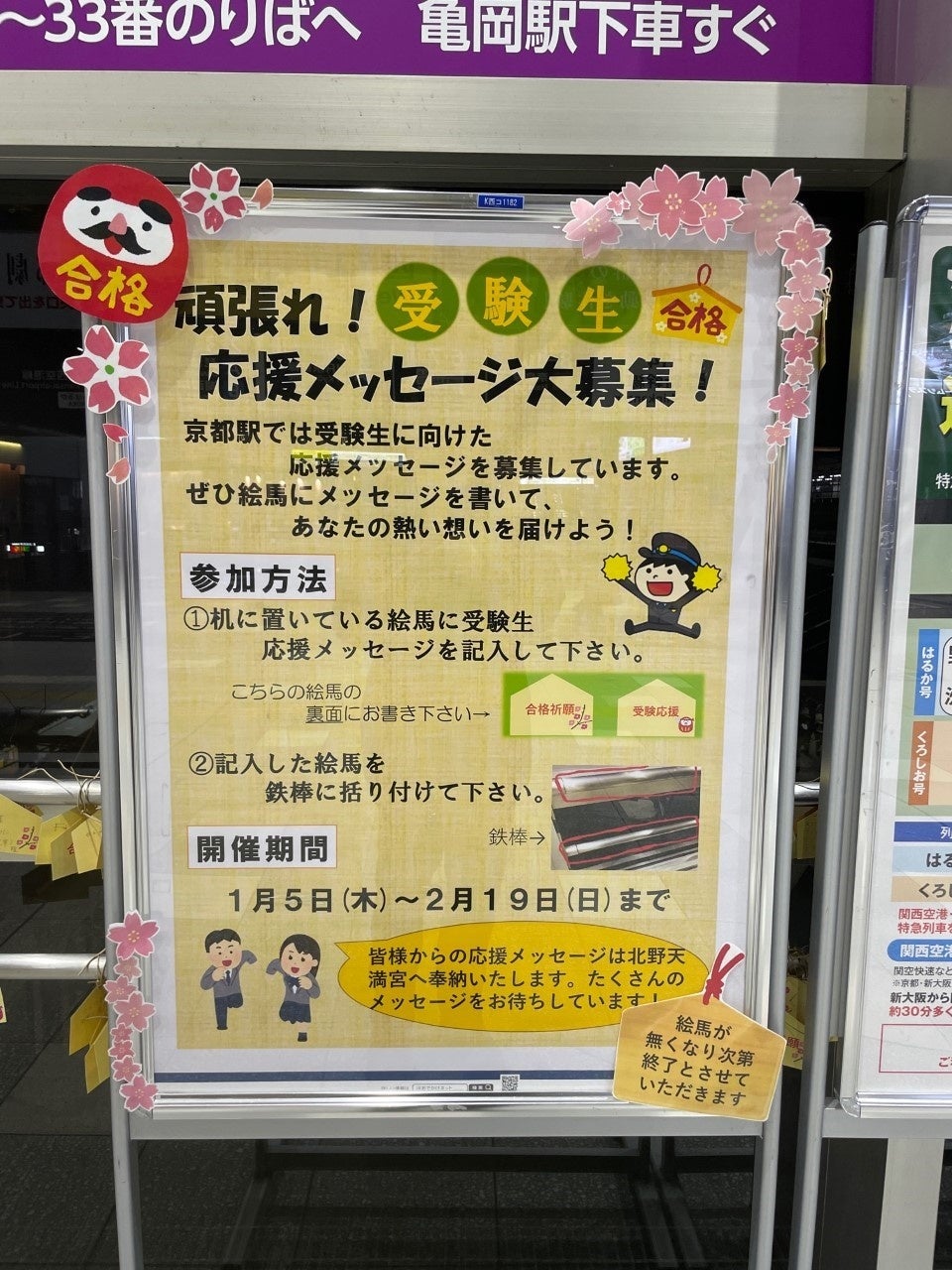 本年 1 月 5 日(木)より、ご家族や友人からの応援メッセージや、受験生の決意表明を絵馬にお書きいただき、京都駅構内に掲出しております。