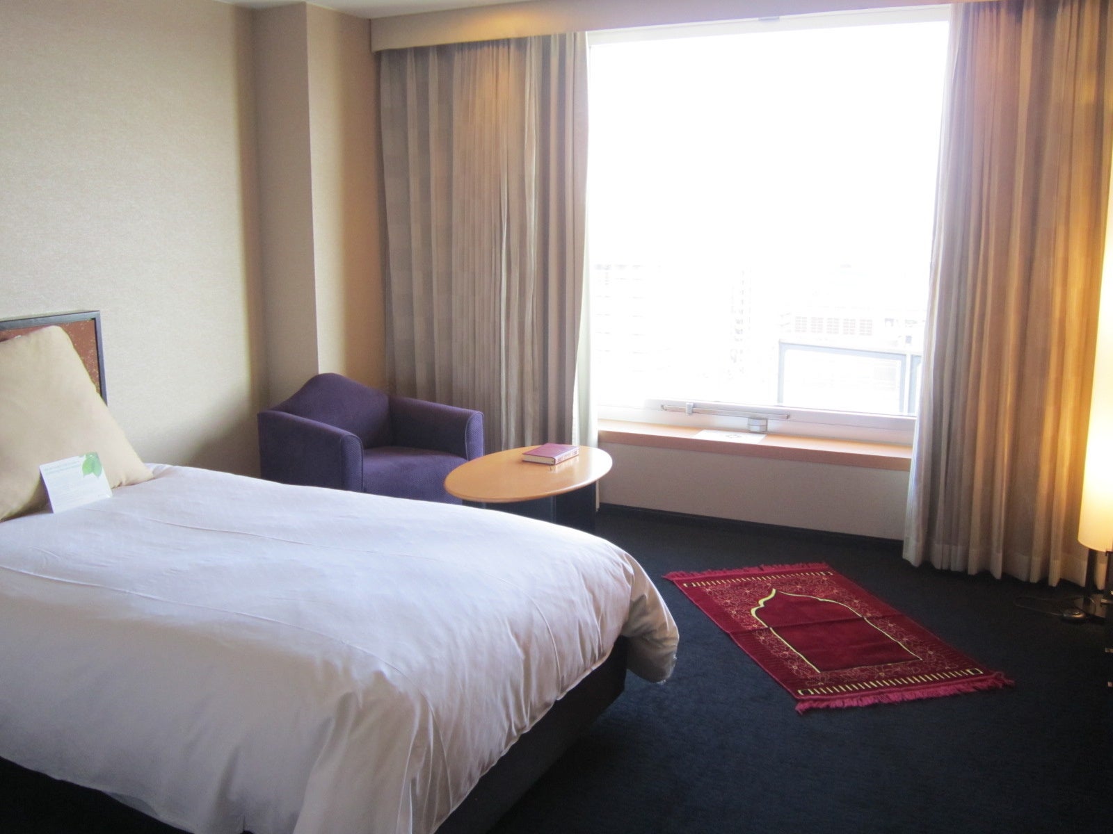 全客室の天井にメッカの方角を記す方位表を備えており、お祈りマットやイスラム教の聖典コーランを入室することも可能です。
