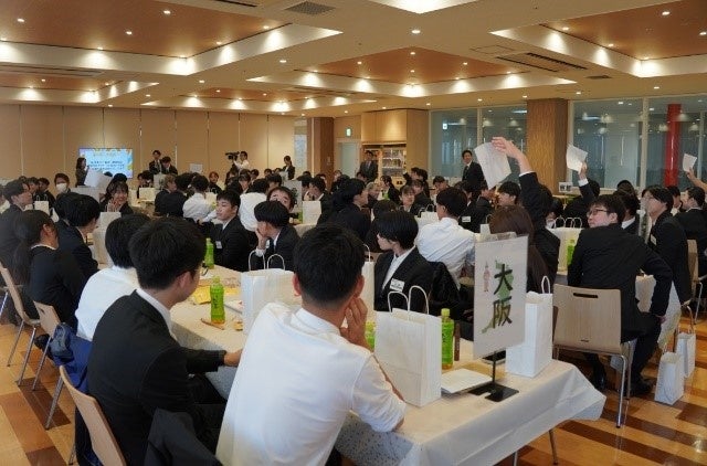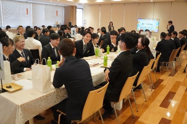 内定者同士の親睦・コミュニケーションの促進のために本部に集合し、内定式終了後には懇親会も開催しました。事前のアンケートで、「ご飯を食べながら親睦を深めたい」という声が多かったことから、平和堂が出店している2府7県にちなんだご当地グルメを食べながら歓談するという形式を取りました。またご当地クイズも開催。チームで協力して難問に挑戦することで、親睦が深まった様子でした。