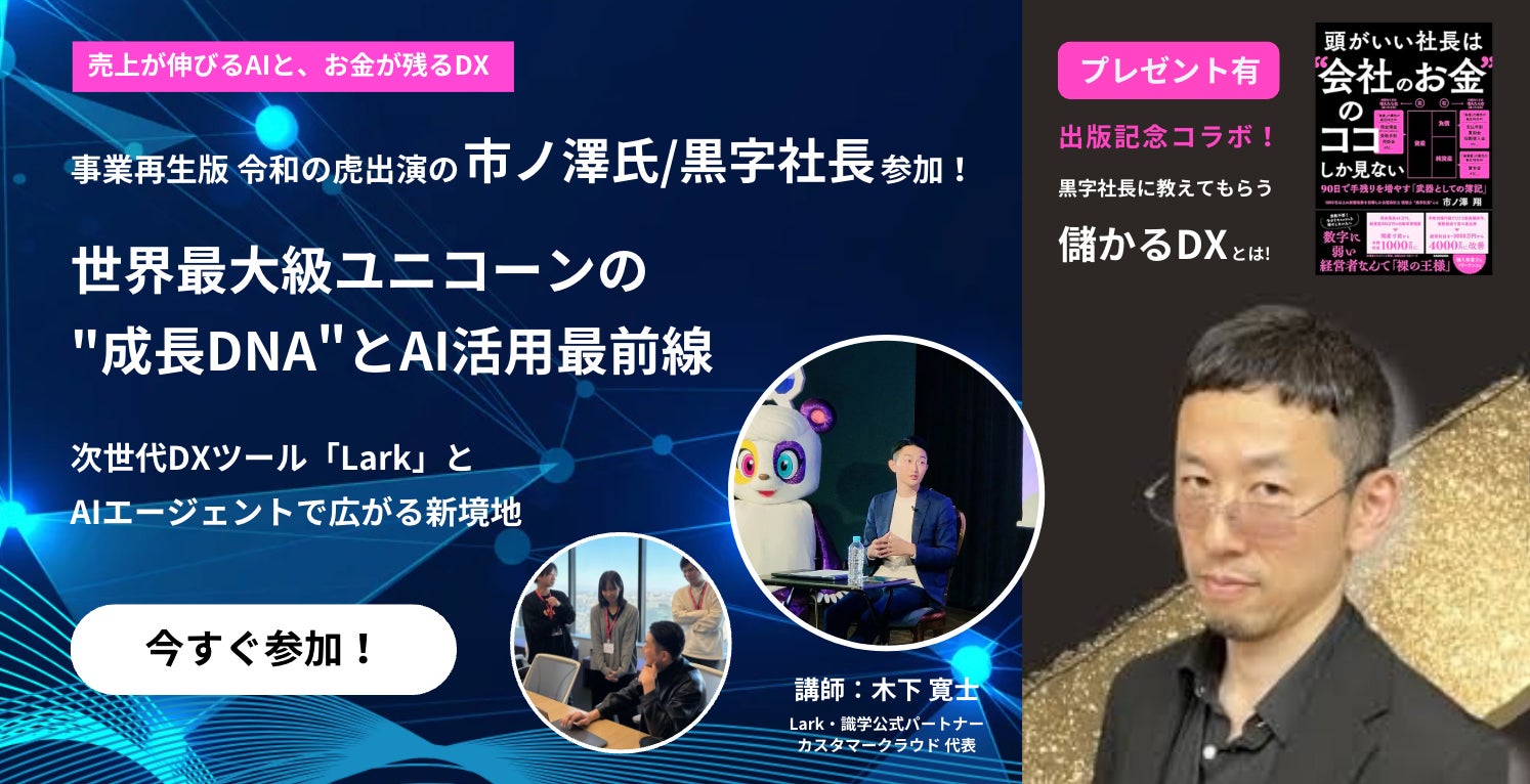 世界的ユニコーン企業が驚異的な成長を遂げた背景には、高度なDX戦略が存在します。 本セミナーでは、その成長DNAと成功メソッドが詰め込まれた次世代ツール「Lark」の実践活用法を中心に、AI活用ノウハウ、AIエージェントの最先端事例もあわせて解説。