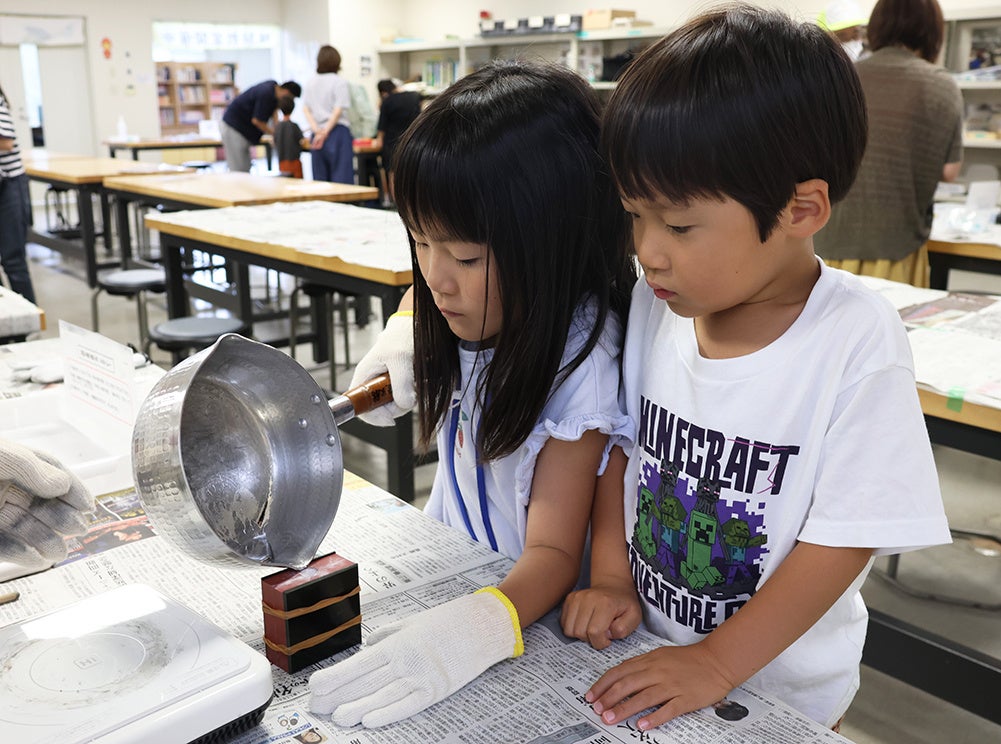 子どもたちが製作したのは、天神山丘陵から発掘された銅鐸と安満宮山古墳から発掘され国の重要文化財に指定されている銅鏡「青龍三年鏡」のレプリカで、いずれも高槻市を代表する文化財です。体験会に参加した10人の子どもたちは、同館の学芸員からマンホールのふたなどにも鋳造の技術が使われていることや製作時の注意点などの説明を受けた後、鋳造体験をスタート。スズなどの合金をナベで200度以上に熱した後、液体となった合金を型に一定のスピードで流し込んでいきました。5分ほど冷ました後、軍手を使って型から外すと、高さ約7センチメートルの銅鐸、直径約5センチメートルの銅鏡が完成。最後に、不要な部分を切り取り、紙やすりで磨いて光沢を出して作品を仕上げました。子どもたちは、鋳型に流し込んだ金属が想像していたとおりの形に出来上がった姿に目を輝かせながら、「うまく完成したよ」や「良い形にできあがった」と喜びの声をあげていました。