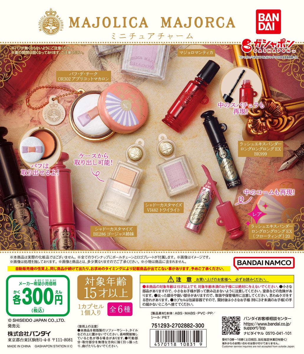 本商品は、メイクアップブランド「マジョリカ マジョルカ」のコスメをミニチュアで再現した全高約40~55mmのチャームです。2003年のブランド誕生から、時代を超えて愛されてきたアイテムの中から厳選した全6種をラインアップしました。