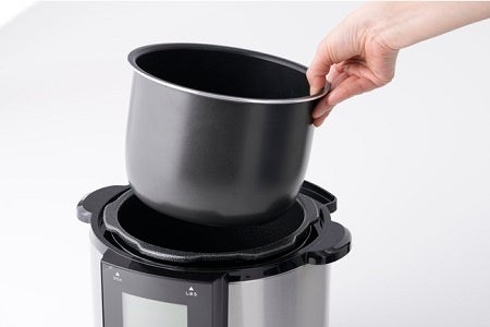 お手入れモードを搭載しているため、使用後の内なべの気になる油汚れやニオイを和らげてくれるので、お手入れがラクになります※3。さらに、内なべは取り外して洗うことができるため、一般的な圧力鍋のように重たい鍋ごとゴシゴシ洗う必要がありません。焦げ付き防止加工だから洗いやすく、圧力調理がますますお手軽になります。