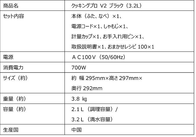 ※商品特長で掲載している写真は「クッキングプロ V2(シルバー)」モデルですが、本商品についても同仕様となります