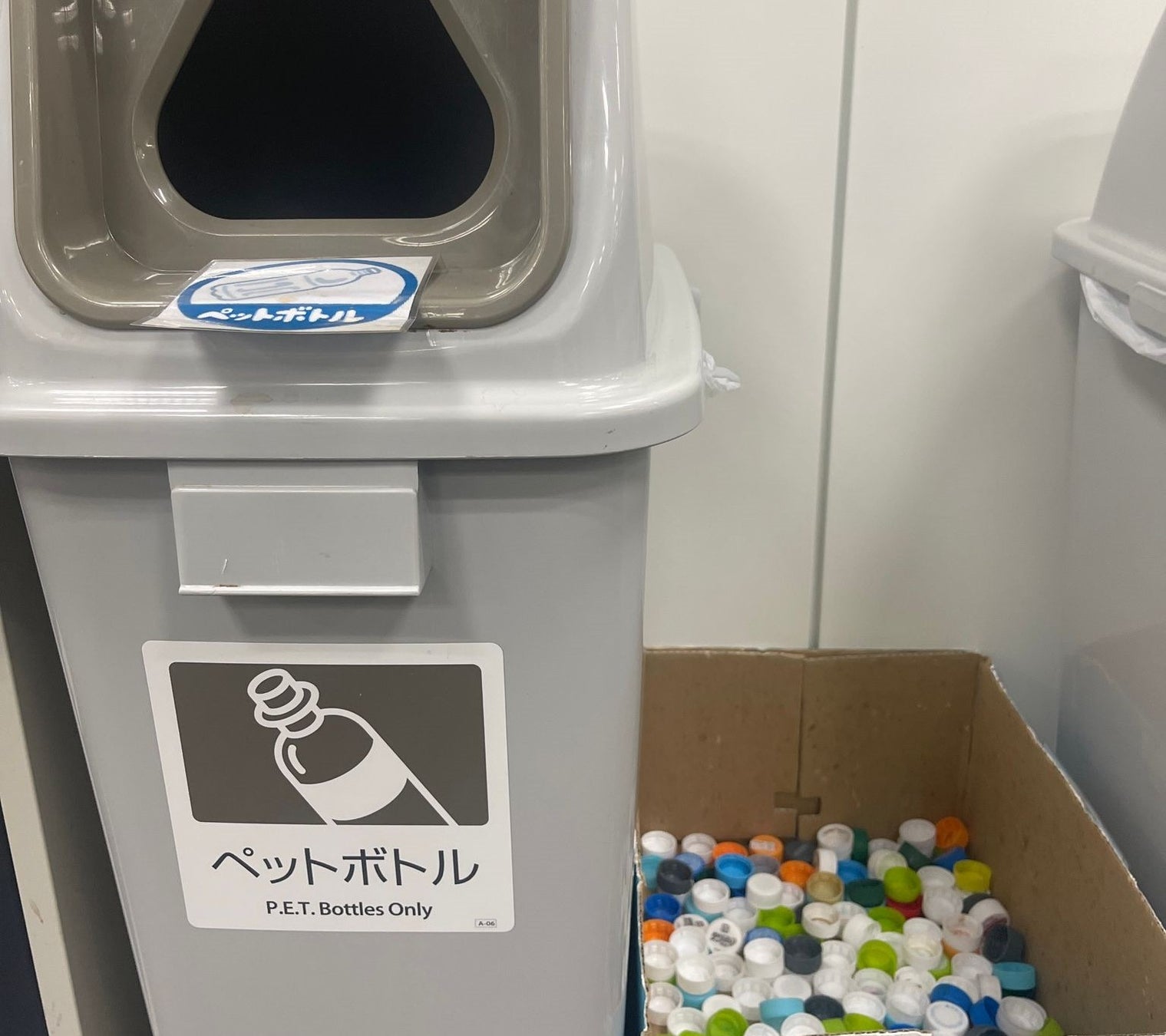 社内のごみ箱の横にはペットボトルキャップの回収ボックスが置かれています。そのまま捨てるのではなく、ペットボトルキャップを外して分別する。小さな積み重ねですが、こういった小さなことから、社会のために私たちが出来ることに取り組んでいます。