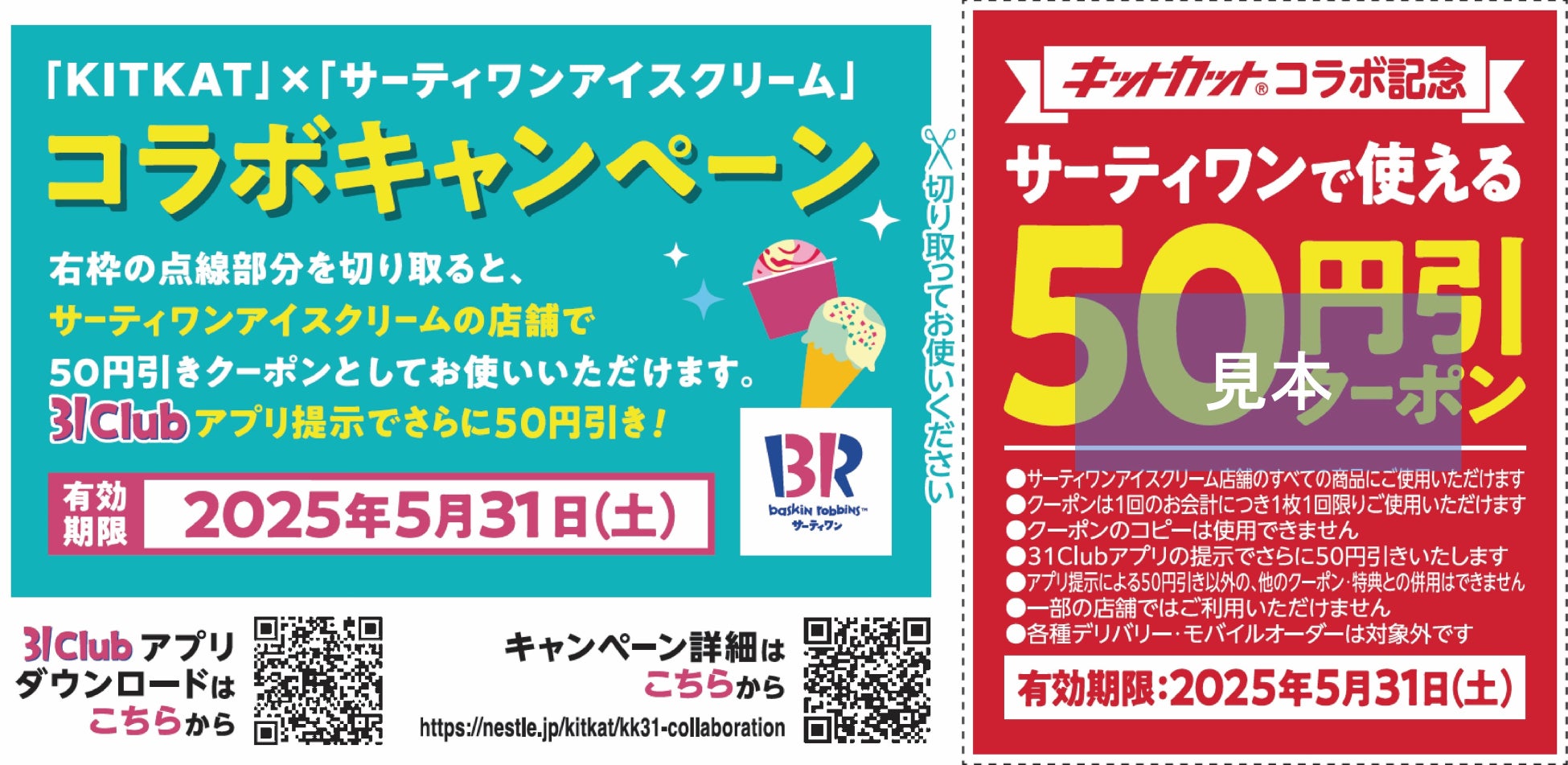パッケージ裏面に付いている“サーティワンで使える50円引クーポン”をサーティワン店舗(一部店舗を除く)に持参すると、サーティワン全商品を50円引きで購入することができます。また、サーティワン公式会員サイト「31Club」アプリの会員バーコード提示でさらに50円引きになります。サーティワンの店舗でも、「キットカット」を使った商品が展開されるため、おウチでも、お近くのお店でも、happyなブレイクタイムをお届けしていきます。