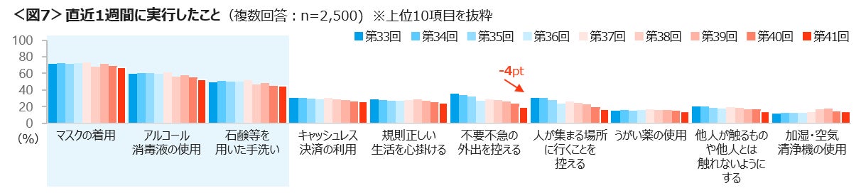 直近1週間で行ったことは、「マスクの着用」「アルコール消毒液の使用」「石鹸などを用いた手洗い」と感染症対策は上位についているものの、低下傾向は続いている。「不要不急の外出を控える」は、先月より4p低下しており、春を迎え外出行動は増えている様子が見て取れる。<図7>