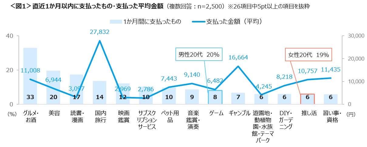 直近1か月間でお金を支払ったモノや活動について聴取をした。「グルメ・お酒」が最も多く33%、次いで「美容」20%、「読書・漫画」17%と続く。男性20代は「ゲーム」、女性20代は「推し活」の割合が高い。支払った事柄に対し金額を確認したところ、「国内旅行」の27,832円が最も高く、「ギャンブル」16,664円、「習い事・資格」11,435円、「グルメ・お酒」11,008円、「推し活」10,757円が平均1万円台である。<図1>
