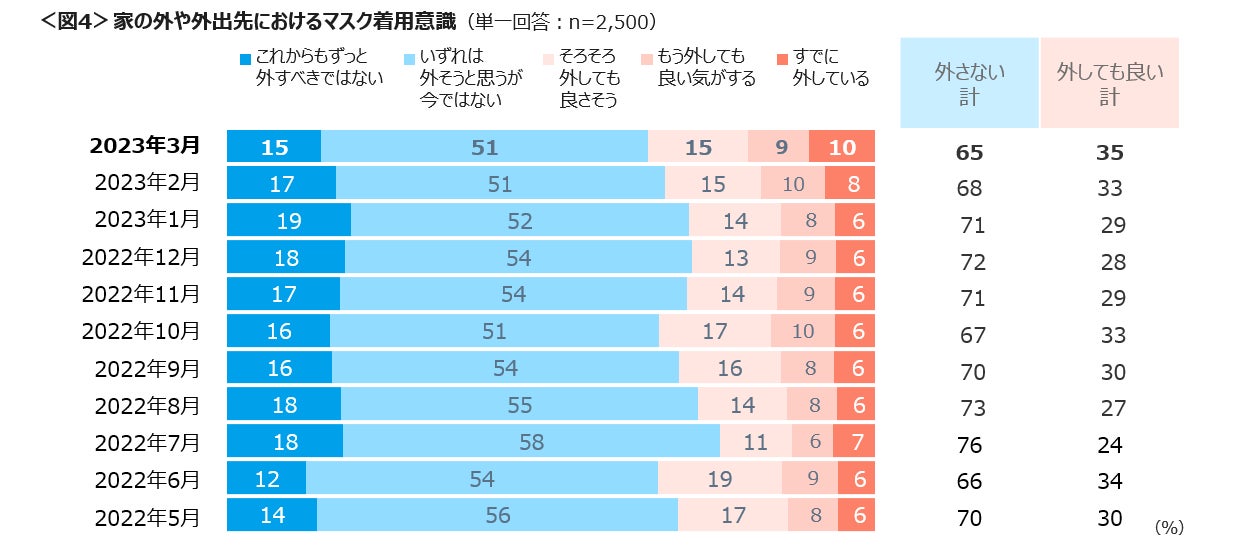 家の外や外出先でのマスク着用意識は、今年に入り低下傾向ではあるものの65%は依然として「マスクを外さない」としている。<図4>