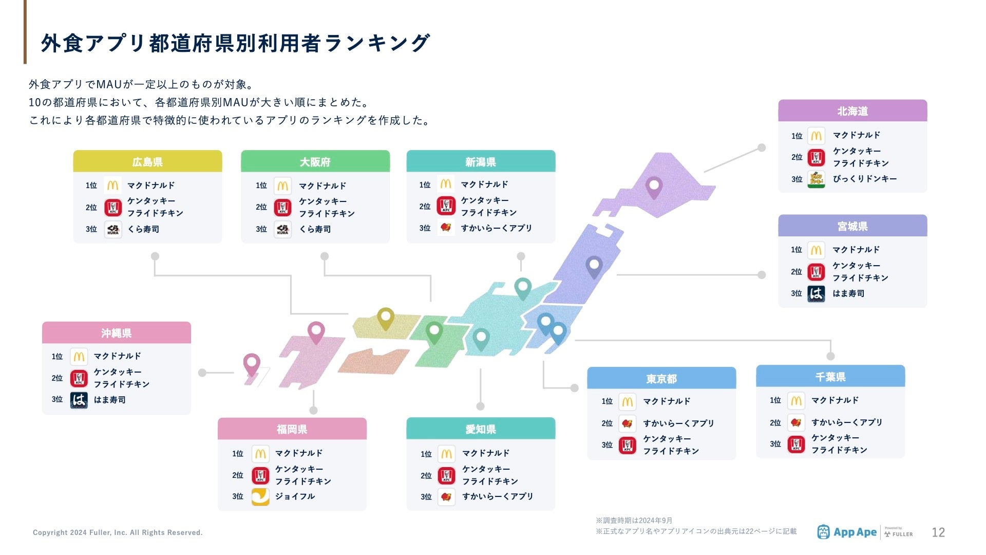 MAUが一定以上の外食アプリを対象に、10の各都道府県別MAUランキングを作成しました。